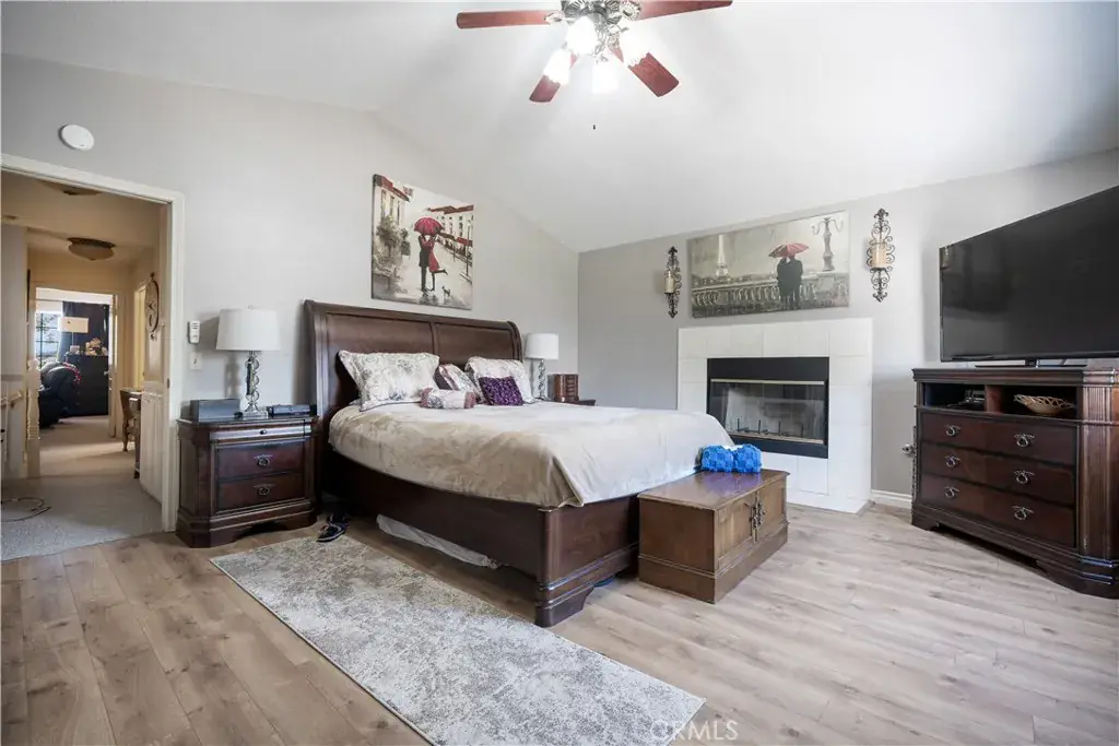 Spacious Main Bedroom with a Walk-In Closet a secondary closet, Ceiling Fan and Gas Fireplace. Main Bathroom has Dual Sinks with custom lighting & a