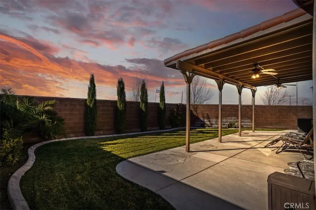 The open-concept family room overlooks the backyard and transitions effortlessly to the outdoor retreat, where a custom covered patio with ceiling fans and integrated lighting creates a refined space for relaxation and gatherings. Enjoy peaceful Antelope Valley mountain views and outdoor living designed for year-round enjoyment.