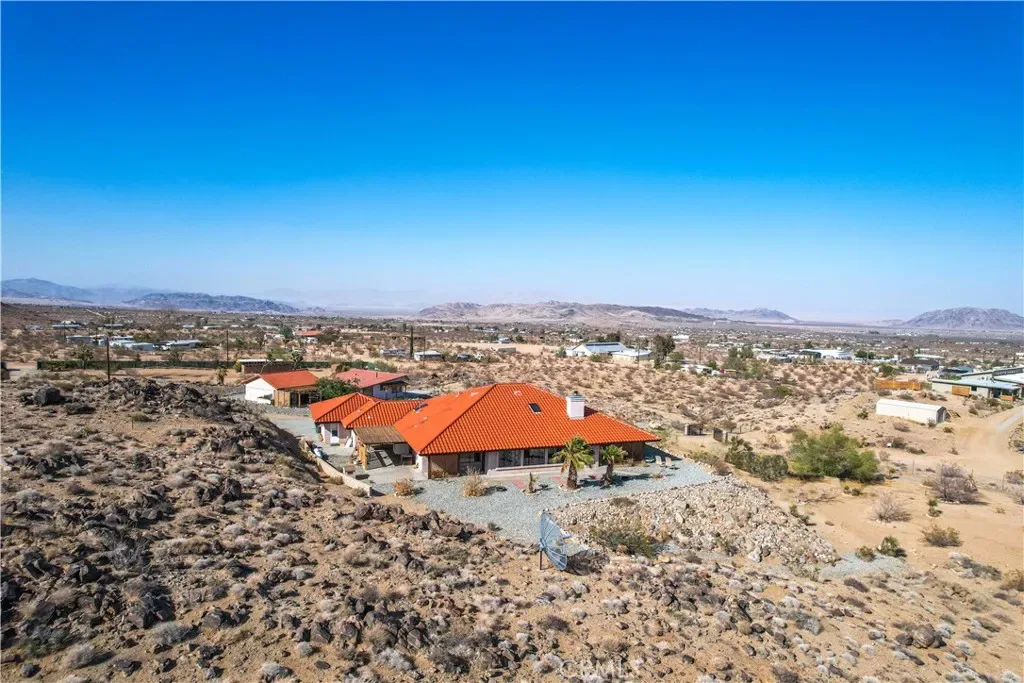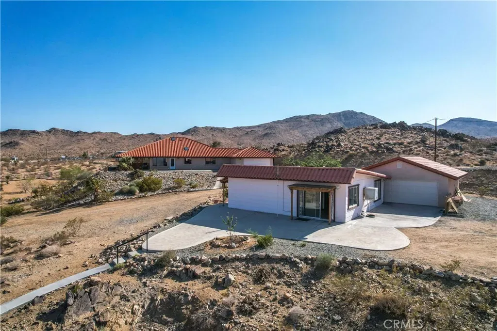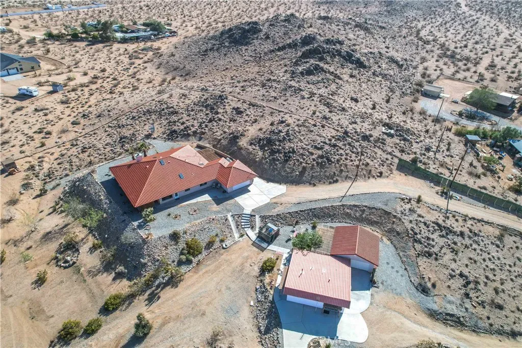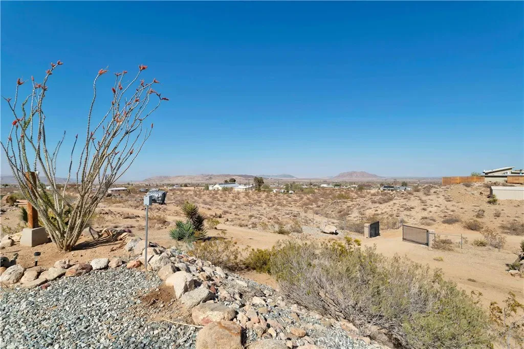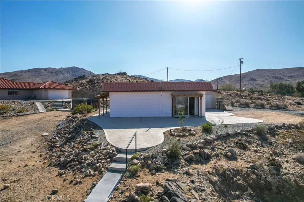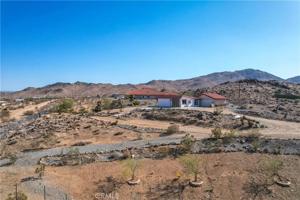 You will be amazed at the stunning views when you arrive. This one-of-a-kind property has two homes nestled against natural rocks. Main home has 2 bedrooms, 2 bathrooms, and a large great room with wood-beamed vaulted ceiling. Extraordinary views from windows on 3 sides. Kitchen has Corian counters with tons of cabinets. L-shape kitchen island has bar seating. Two large bedrooms with 3 walk-in closets. Huge soaking tub in the master bath. There is a south-facing sunroom which is perfect for soaking up the winter sun. The indoor laundry room has plenty of cabinets for all your storage needs. 2 car attached garage. The front patio runs the length of the home and provides endless eastern views. This home is perfect for hosting large parties or gatherings. The 2nd home has 1 bedroom, 1 bath with an enclosed porch. It also has it’s own detached 2 car garage. The views from this 2nd home are incredible as well. The entire property of 5 acres is fully fenced with two gated entrances. Property is dotted with Joshua Trees, Palm Trees, Palo Verde trees, and Mojave Yuccas. Natural desert wildlife can often be seen, such as Quail, Rabbits, Coyotes and more. Landers is home to the Integraton, La Copine restaurant and world-famous Gublers Orchids. Popular riding trails nearby. Joshua Tree National Park is a mere 25 minutes away. Big Bear is 1 hour drive. This amazing property is perfect for vacation rental, wedding venue or other creative ideas. Live in one and rent the other. Many possibilities. Make your appointment to view today. Buyer to verify details and zoning etc.