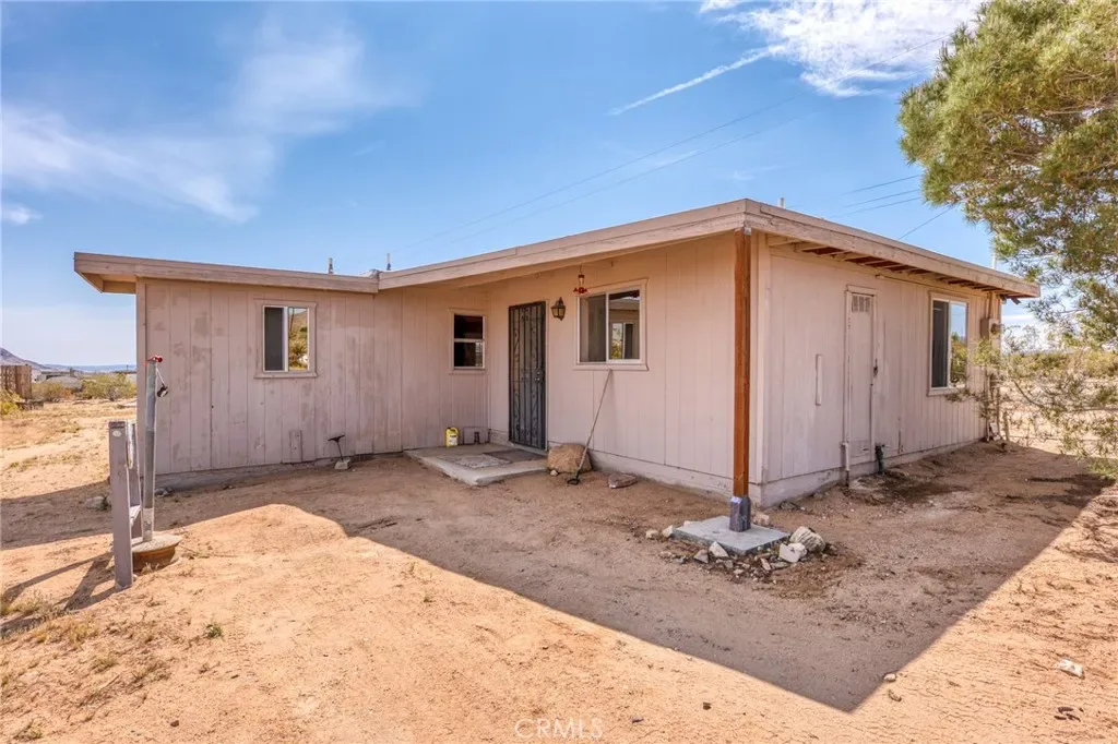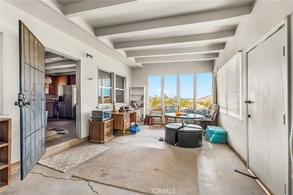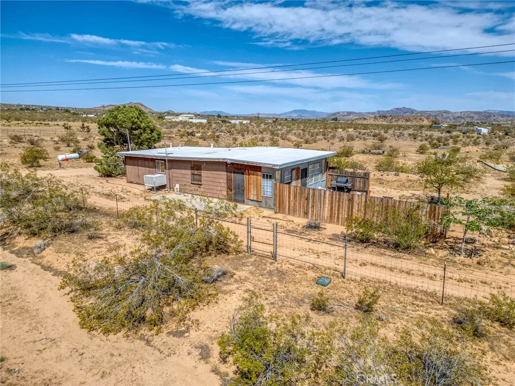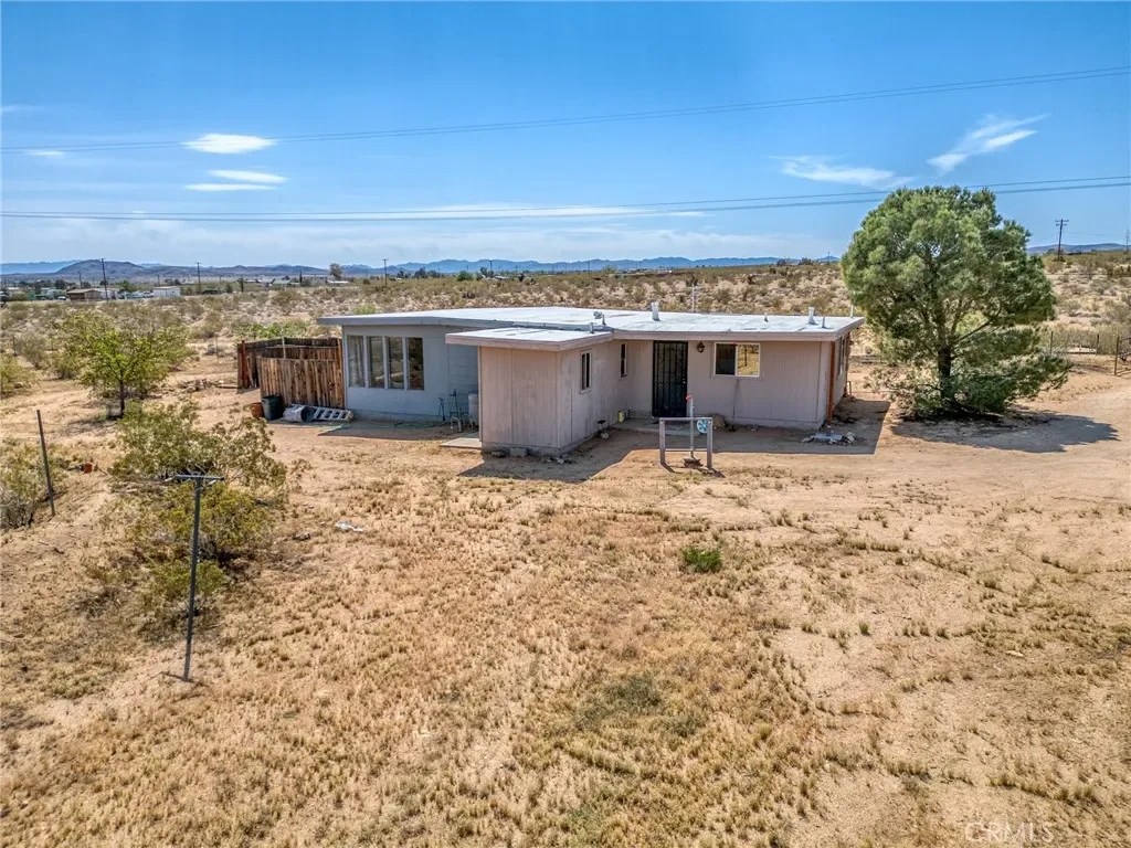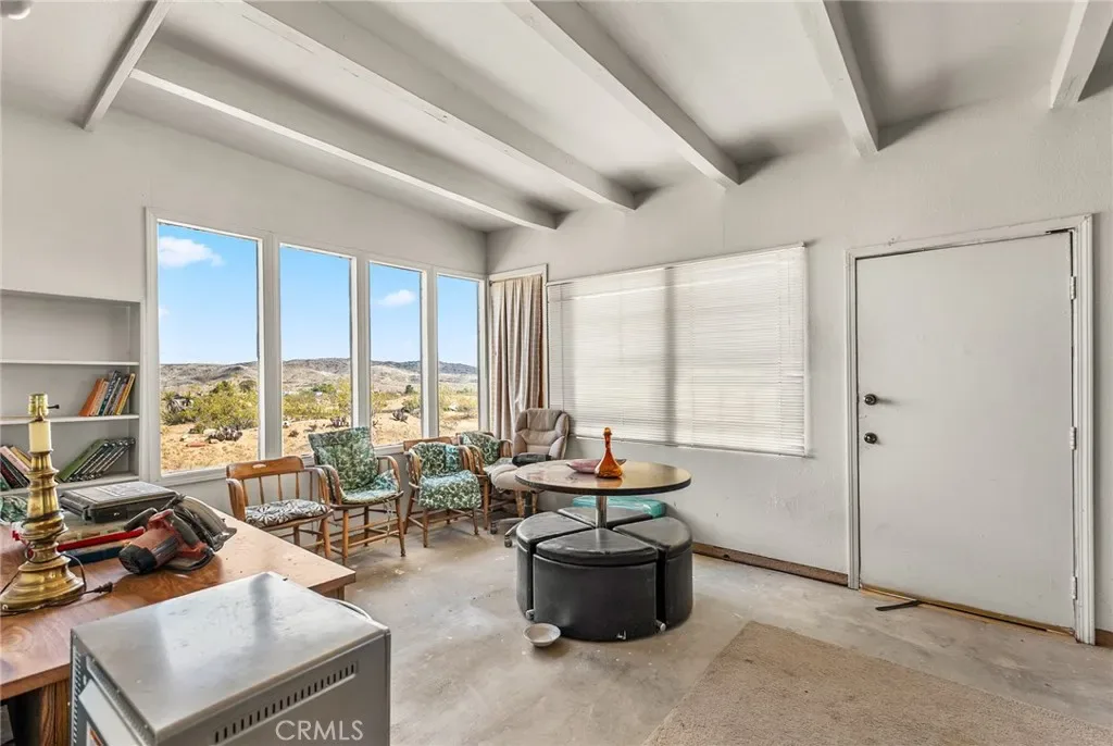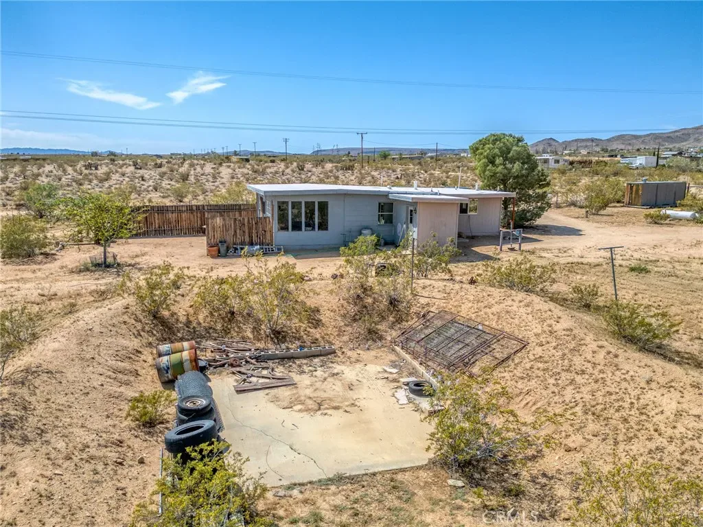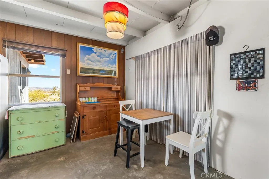 Set on 5 acres of buildable desert land in Landers, this 1957 built home offers a unique opportunity for investors or buyers looking to create a personalized retreat. With 774 square feet of living space, the property blends vintage character with untapped potential. Approximately half of the lot is fenced, providing a defined area for immediate use while leaving ample room for expansion, additional structures, or outdoor enhancements. Inside, the home features an open concept layout that connects the living room, kitchen, and dining area, creating a welcoming central space. Concrete floors and wood beam ceilings run throughout, adding to the home’s rustic desert charm. The kitchen is quaint and full of personality, complete with laminate countertops, a vintage white square tile backsplash, and warm wood paneling. Just off the kitchen, the dining area includes sliding glass doors that open to the yard, inviting in natural light and offering seamless indoor/outdoor flow. A standout feature is the sunroom, filled with abundant natural light from surrounding windows, along with a concrete floor and wood beam ceiling creating an ideal space for relaxing, entertaining, or reimagining as a creative studio. The bedroom is bright and comfortable, with built in lighting on either side of the bed, two closets, and two additional linen style storage closets. The bathroom includes a single sink vanity with generous counter space, a toilet, and a walk-in shower. Located in the peaceful high desert community of Landers, known for its wide open spaces, star filled skies, and proximity to Joshua Tree National Park, this property offers both tranquility and investment potential. With its vintage appeal and solid bones, this home is being sold as-is and does require some updates making it a perfect project for investors or those looking to restore and enhance a desert getaway.