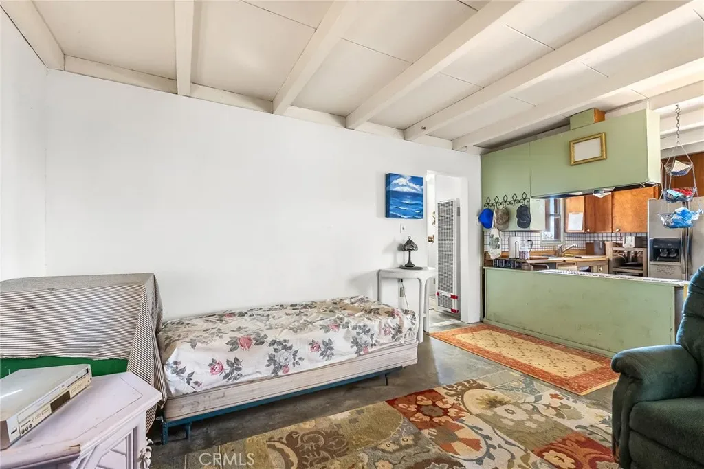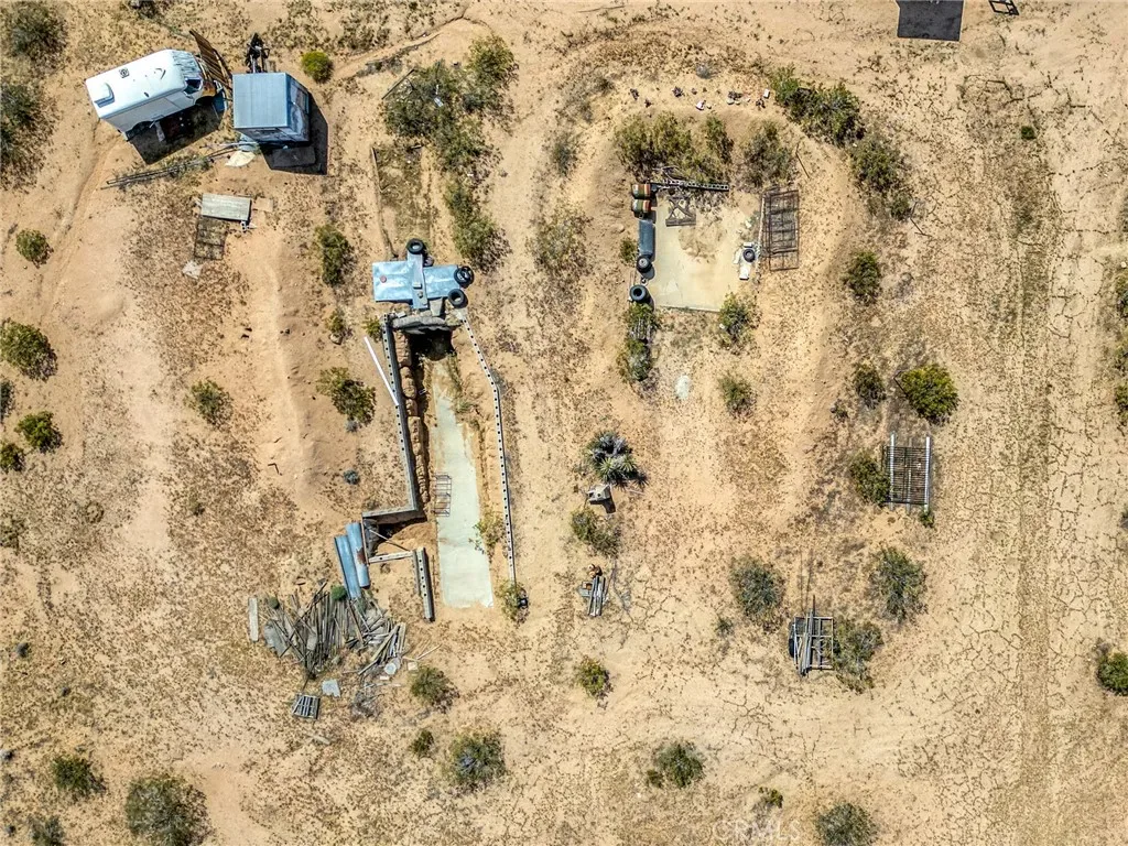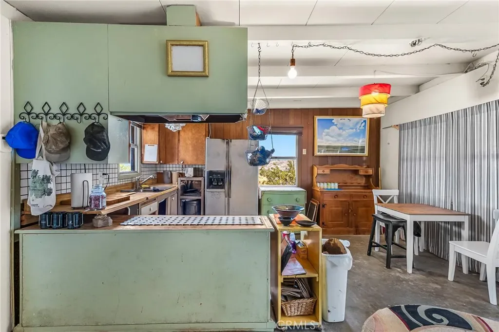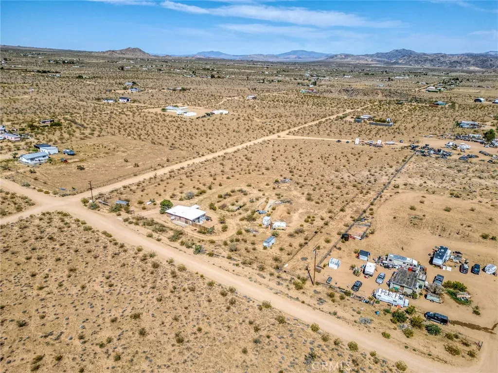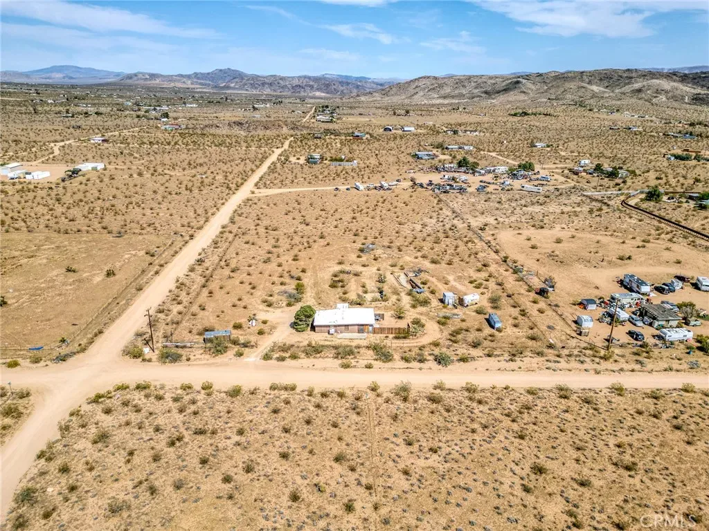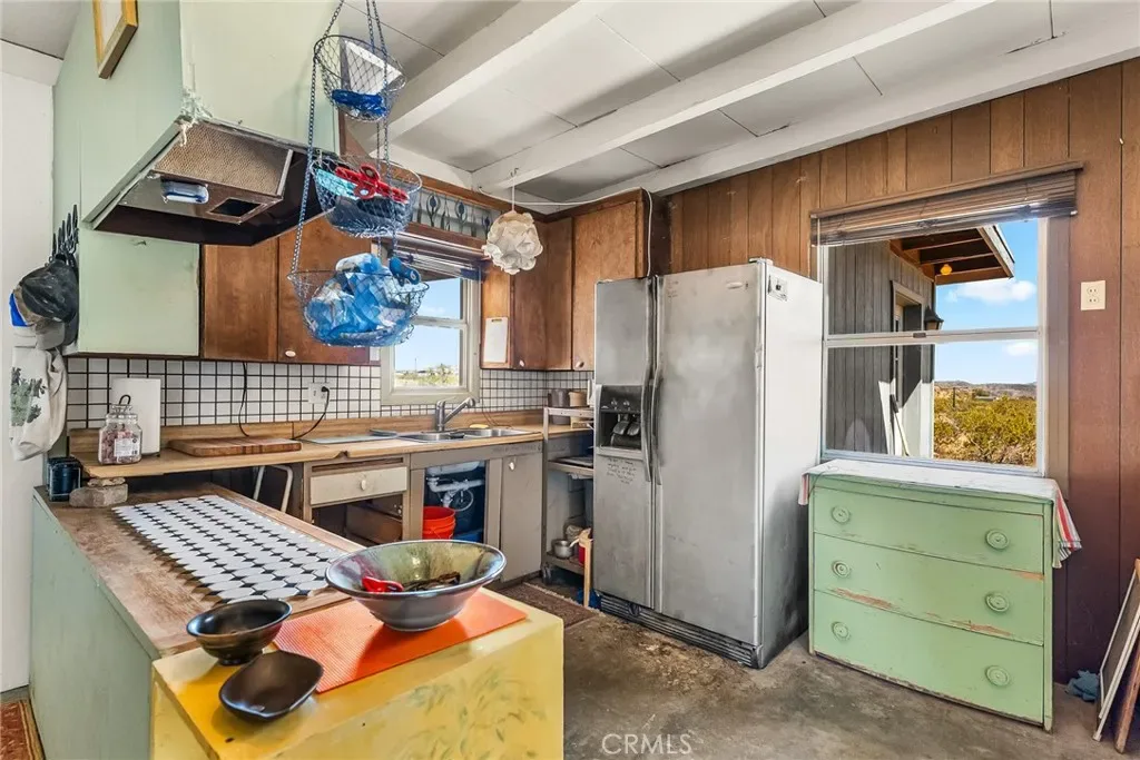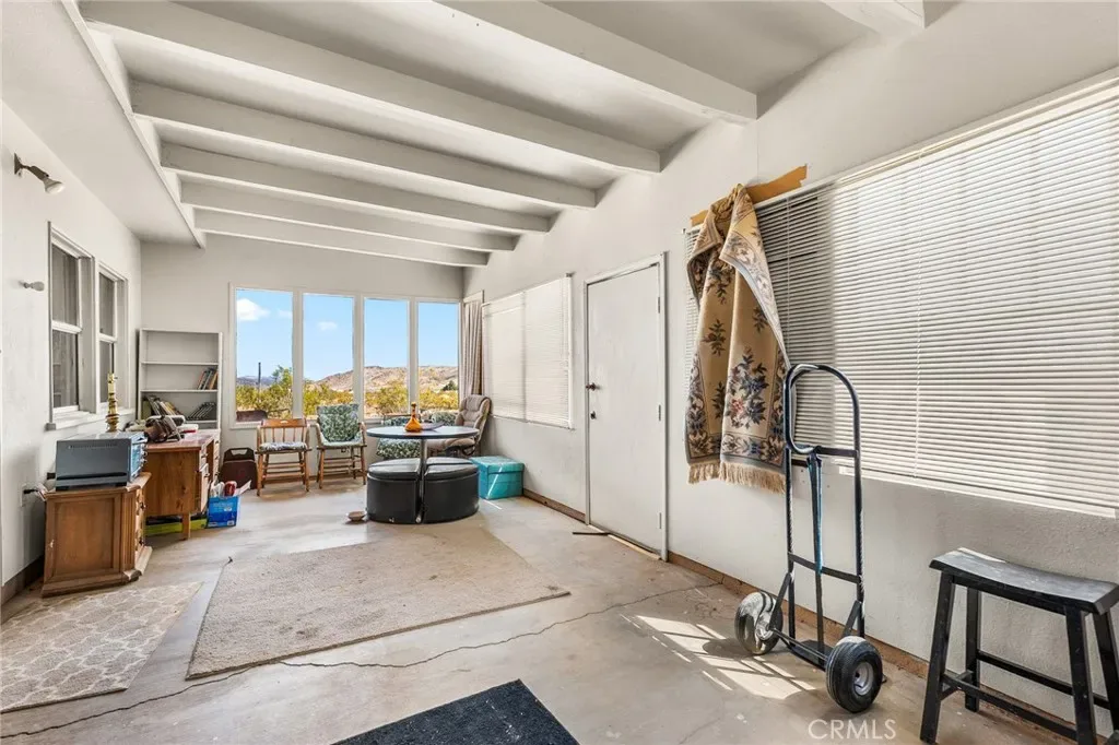 Set on 5 acres of buildable desert land in Landers, this 1957 built home offers a unique opportunity for investors or buyers looking to create a personalized retreat. With 774 square feet of living space, the property blends vintage character with untapped potential. Approximately half of the lot is fenced, providing a defined area for immediate use while leaving ample room for expansion, additional structures, or outdoor enhancements. Inside, the home features an open concept layout that connects the living room, kitchen, and dining area, creating a welcoming central space. Concrete floors and wood beam ceilings run throughout, adding to the home’s rustic desert charm. The kitchen is quaint and full of personality, complete with laminate countertops, a vintage white square tile backsplash, and warm wood paneling. Just off the kitchen, the dining area includes sliding glass doors that open to the yard, inviting in natural light and offering seamless indoor/outdoor flow. A standout feature is the sunroom, filled with abundant natural light from surrounding windows, along with a concrete floor and wood beam ceiling creating an ideal space for relaxing, entertaining, or reimagining as a creative studio. The bedroom is bright and comfortable, with built in lighting on either side of the bed, two closets, and two additional linen style storage closets. The bathroom includes a single sink vanity with generous counter space, a toilet, and a walk-in shower. Located in the peaceful high desert community of Landers, known for its wide open spaces, star filled skies, and proximity to Joshua Tree National Park, this property offers both tranquility and investment potential. With its vintage appeal and solid bones, this home is being sold as-is and does require some updates making it a perfect project for investors or those looking to restore and enhance a desert getaway.