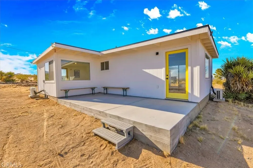 Set on 2.5 acres in the heart of Landers, this fully rebuilt and thoughtfully expanded 2-bedroom, 2-bath home offers striking, unobstructed views of Goat Mountain right from the center of the property. Nearly everything is brand new, blending modern efficiency with artistic character. Inside, the bathrooms are a true highlight, featuring a deep soaking tub perfectly positioned beneath a window and finished with vibrant, colorful grout that adds a unique designer touch. The living room is anchored by a cozy wood stove and a custom-designed sofa with integrated storage (removable if desired), while energy-efficient mini splits provide year-round comfort in both hot desert summers and cool winter nights. A dedicated laundry area adds everyday convenience. Outdoors, two patios create ideal spaces for relaxing or entertaining under the wide-open desert sky, highlighted by a mature Joshua tree—a special and increasingly rare feature in this part of Landers. The property also includes two sheds—one well-suited as an art studio or home office—and a vintage Airstream that can be included in the sale, adding extra charm and flexibility. Located just one block from pavement for easy access, and within close proximity to local favorites like the Integratron, Gubler’s Orchids, and La Copine, this home is also just 25 minutes to Joshua Tree National Park and 20 minutes to Pappy & Harriet’s, making it a perfect full-time residence, weekend escape, or investment opportunity. Please note, current owner is paying $4,503 in annual tax, some platforms did not update to show correct amount.