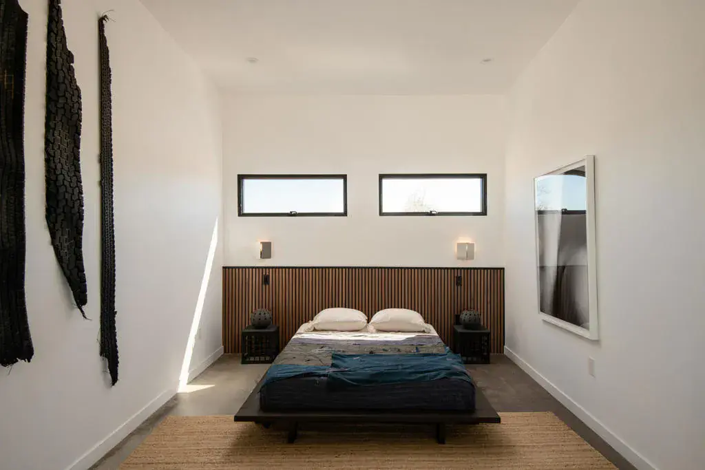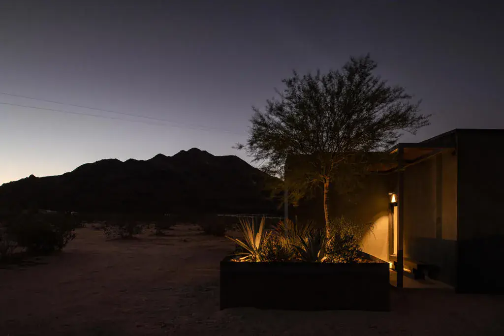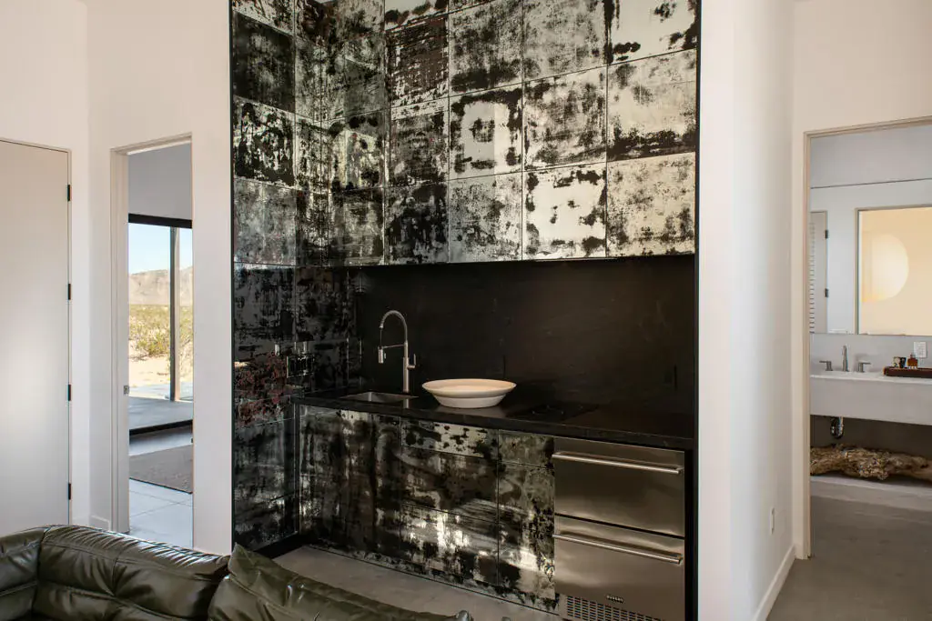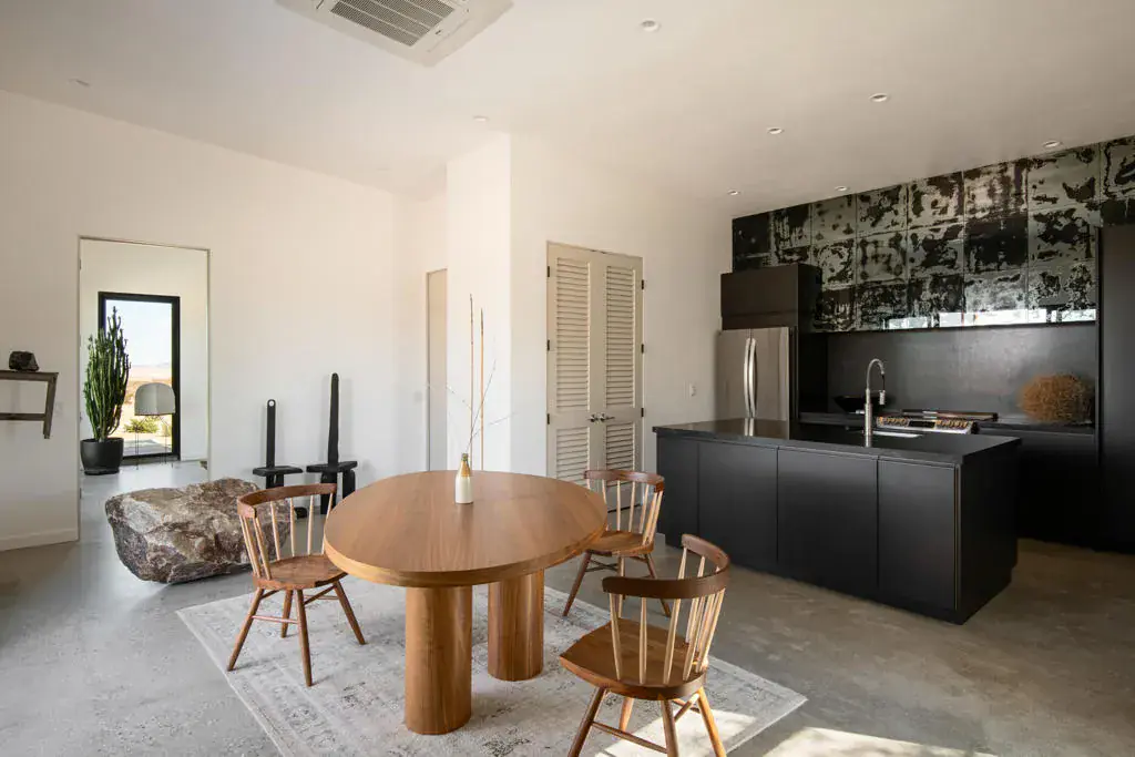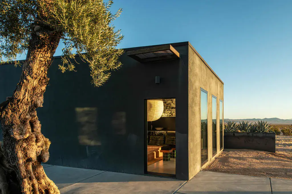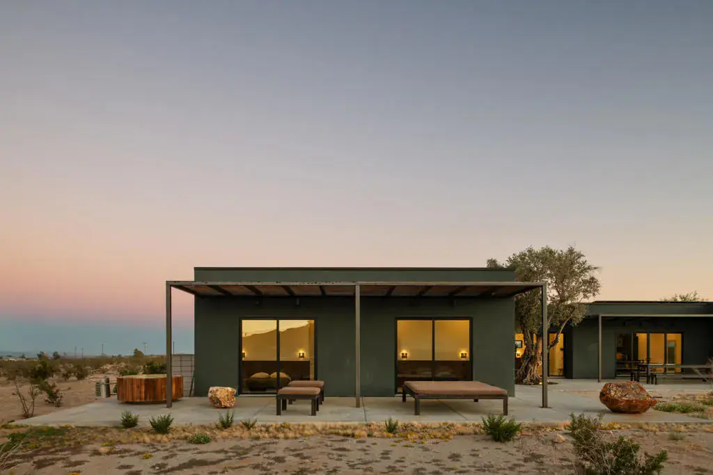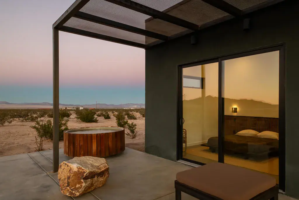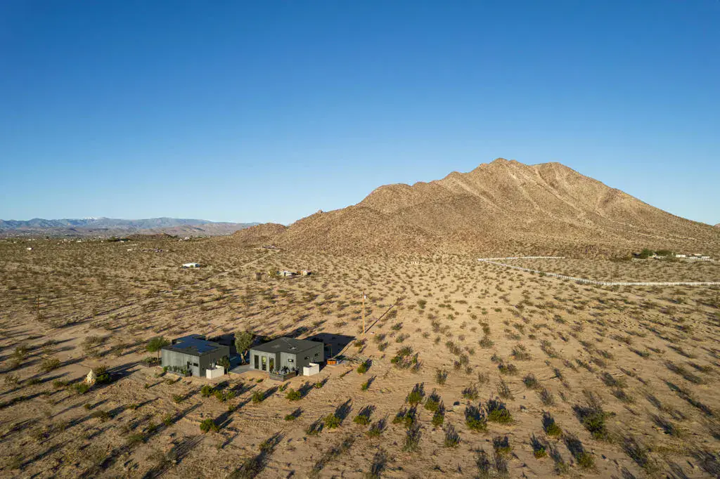 The Goat Mountain HouseA 2024 architectural desert compound set against the raw beauty of the Mojave.Welcome to The Goat Mountain House, a contemporary, design-forward retreat conceived for those who value architecture as art. Completed in 2024, this modern minimalist compound comprises two sculptural volumes: a striking main residence and a generous guest house, each thoughtfully positioned to harmonize with the surrounding landscape and capture the quiet grandeur of Goat Mountain.The main house features clean lines, smooth stucco walls, and soaring ceilings that create a sense of calm and openness. Floor-to-ceiling glass frames expansive High Desert views, flooding the interior with natural light and connecting every space to the rugged beauty outside. A refined kitchen with a large island anchors the open-concept layout, flanked by two serene bedrooms and a spa-like bath.A west-facing covered patio extends the living area outdoors, ideal for al fresco dining beneath endless desert skies. Between the two structures, a mature olive tree offers a sculptural focal point and anchors the flow of the compound.The guest house mirrors the home’s aesthetic with its own living area, kitchenette, two bedrooms, and a beautifully finished bath. Outside, a wood-paneled hot tub and private patio create a perfect vantage point for stargazing or quiet morning coffee.Set in one of the most desirable pockets of the desert, the property offers rare tranquility, sweeping panoramic views, and a feeling of total serenity, all just minutes from Joshua Tree National Park, La Copine, the Integratron, and the shops and dining of Pioneertown and Yucca Valley.Custom planter boxes with sculptural cacti and a bespoke stone fire feature complete the setting, an intentional blend of restraint and warmth.More than a home, The Goat Mountain House is a living composition, an architectural retreat that functions beautifully as a full-time residence, a second home, or a design-forward short-term rental investment. It embodies the essence of the High Desert with expansive views, inspired design, and absolute quiet.