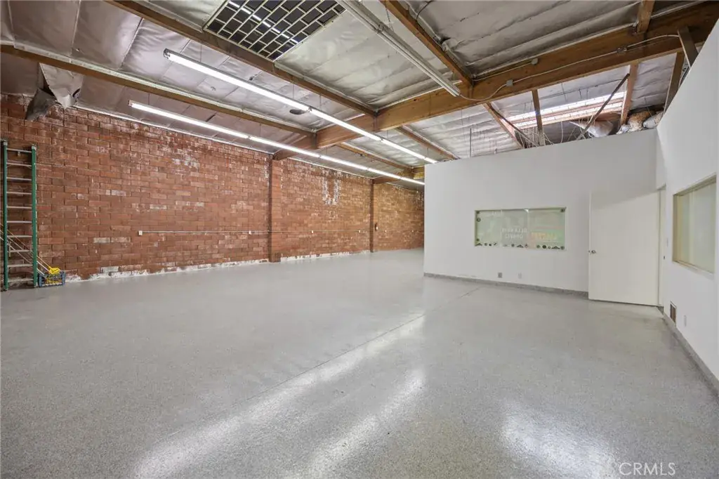 The building features one grade-level garage opening with approximately 8.5-foot clear height and is functionally partitioned with warehouse and storage/garage space on one side and a dedicated office/reception area on the other, providing operational flexibility for a range of business types.