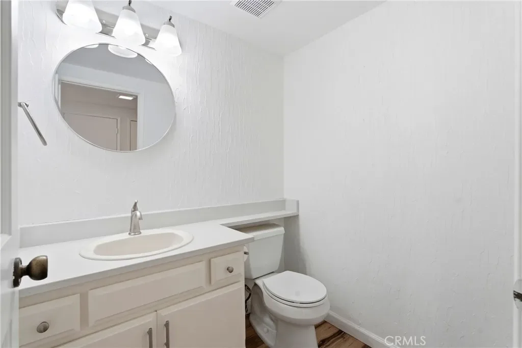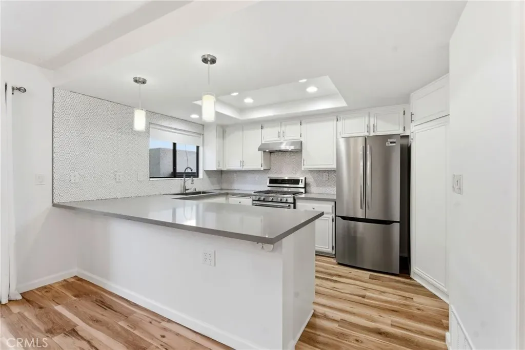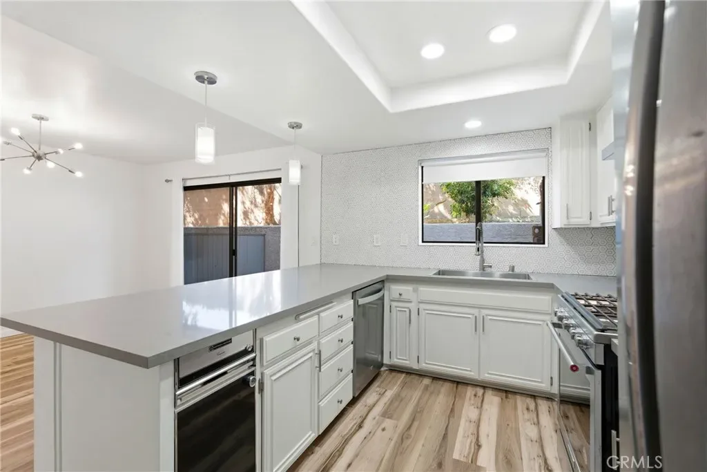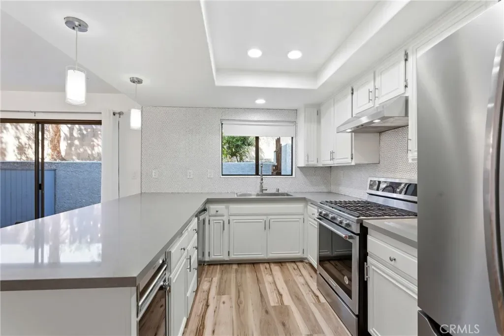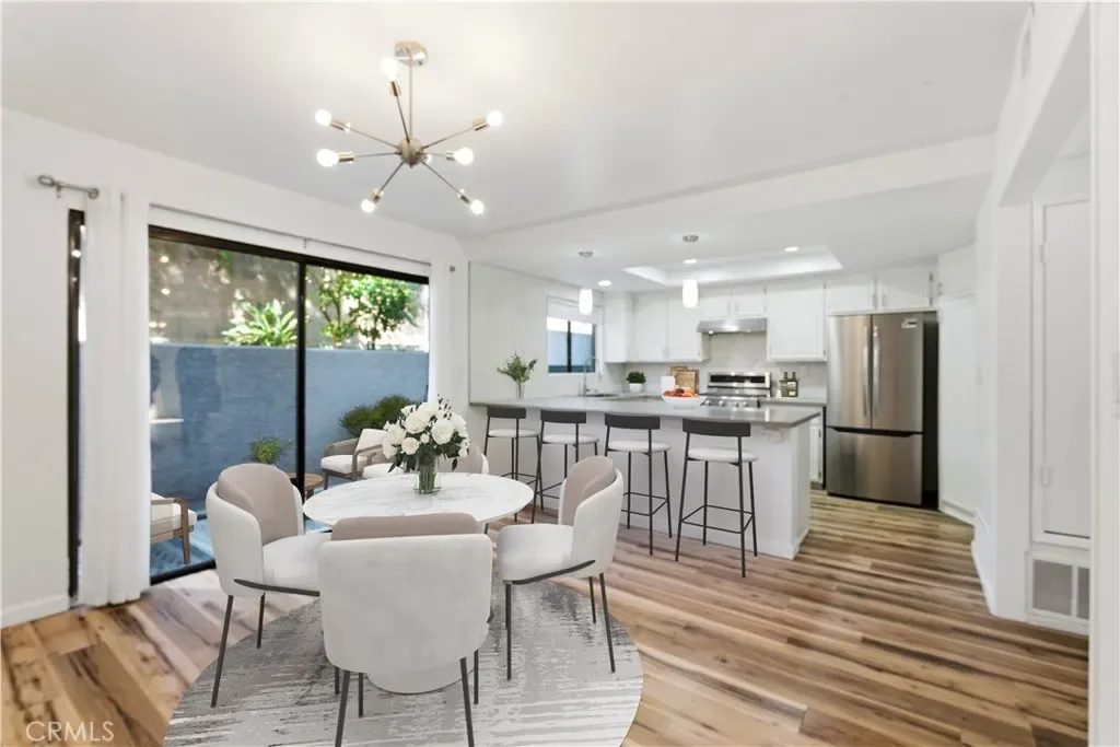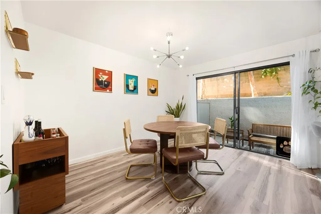 The dining area shines with a modern light fixture and opens to a private patio, perfect for hosting or unwinding. The beautifully updated kitchen is a standout, complete with quartz counters, breakfast bar, stainless steel appliances, pantry, abundant cabinetry, and stylish pendant and recessed lighting. A convenient guest bath completes the main level.
