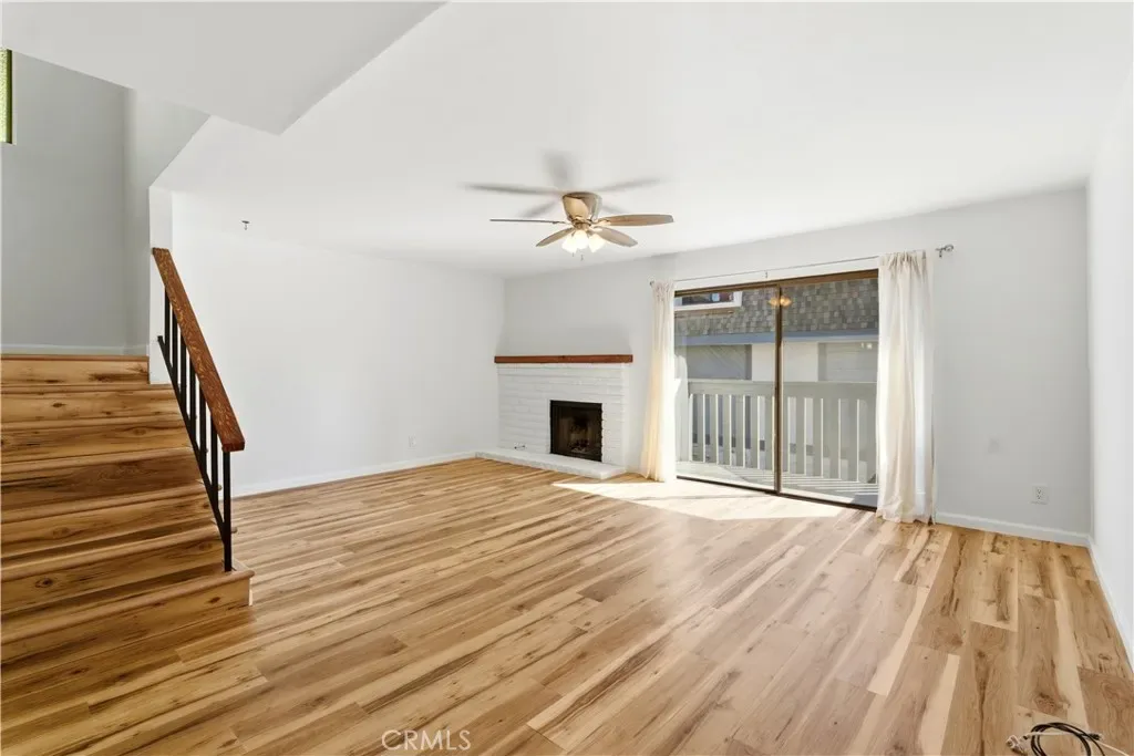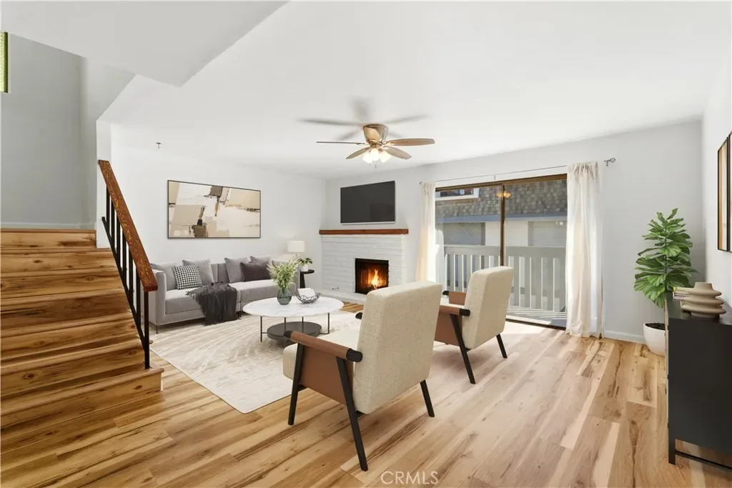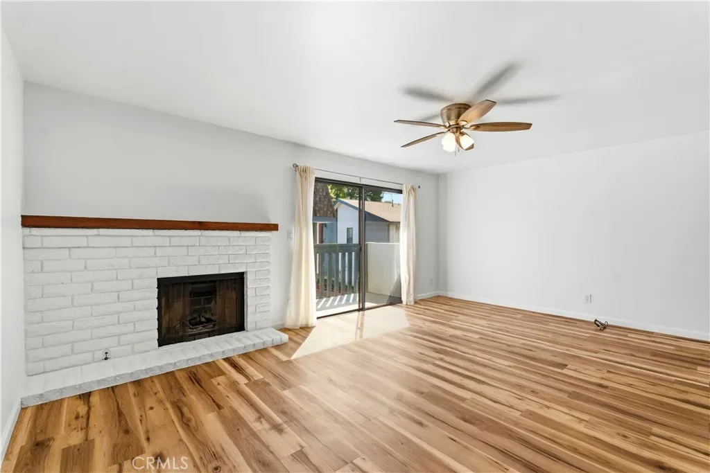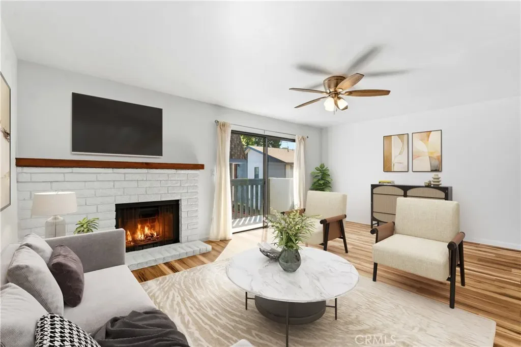 The inviting living room is ideal for both relaxing and entertaining, featuring a classic brick fireplace, smooth ceilings, ceiling fan, and contemporary plank-style flooring. Sliding glass doors open to a private balcony—bringing in sunlight and creating a seamless indoor-outdoor flow.