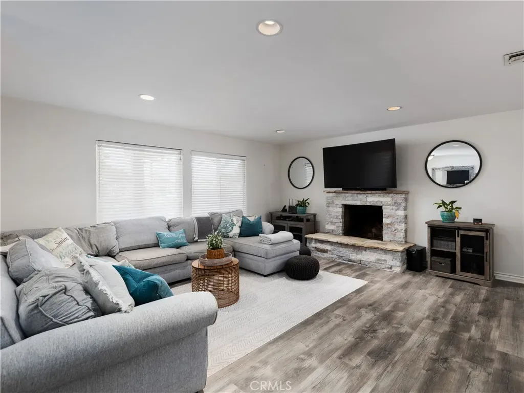 Inside, enjoy a freshly remodeled interior featuring new paint, luxury vinyl plank flooring, and plush carpet in the bedrooms. The bright living room centers around a striking stone fireplace with modern mantel, pre-wired for a flat-screen TV, and flows seamlessly into the dining area and upgraded kitchen. The kitchen offers granite countertops, stainless steel appliances, and shaker-style cabinetry, opening to a large flex space ideal for a formal dining room, second living room, or game room.