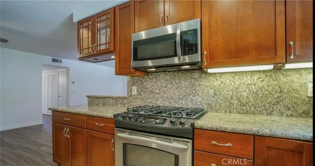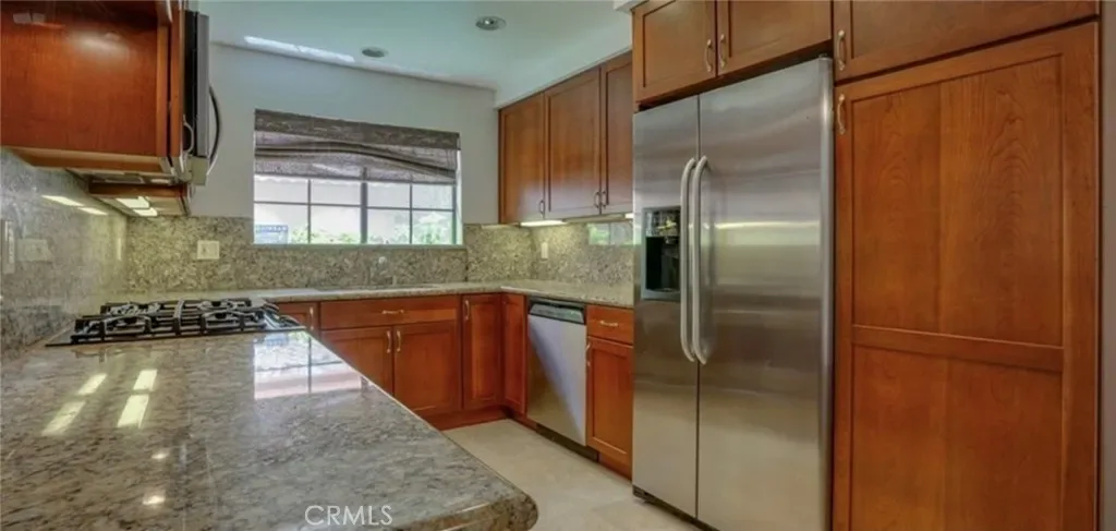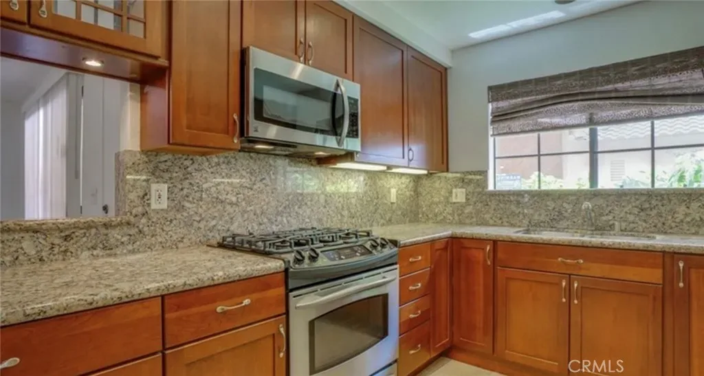 Enjoy the expansive private front patio—perfect for morning coffee, tea, or outdoor dining. The remodeled kitchen features granite countertops, travertine flooring, and stainless steel appliances, including a refrigerator, dishwasher, range/oven, and built-in microwave.