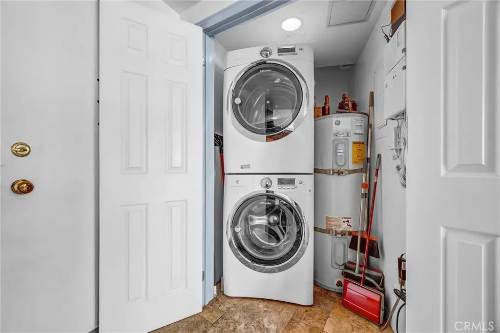 Additional highlights include two subterranean parking spaces, an in-unit washer and dryer, refrigerator, microwave, and generous storage.