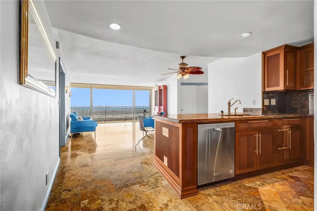 This beautifully maintained 1-bedroom, 1.5-bath residence features high-quality finishes throughout, including custom cabinetry with intelligent soft-close doors and expanded storage, granite countertops, stainless steel appliances, and timeless travertine flooring. The primary bathroom showcases artistic designer ceramic tile work. Floor-to-ceiling sliding glass doors maximize natural light and frame the spectacular ocean views, while an easy-to-operate shade system lets you adjust the light for comfort and ambiance. The spacious bedroom includes a custom closet and mirrored accents.