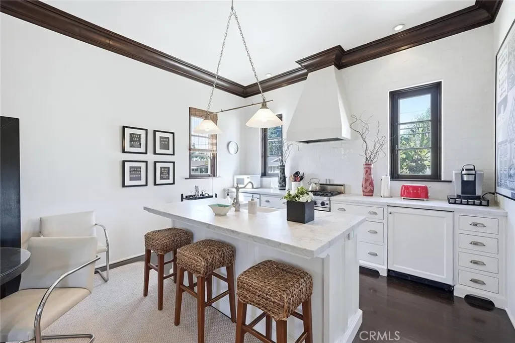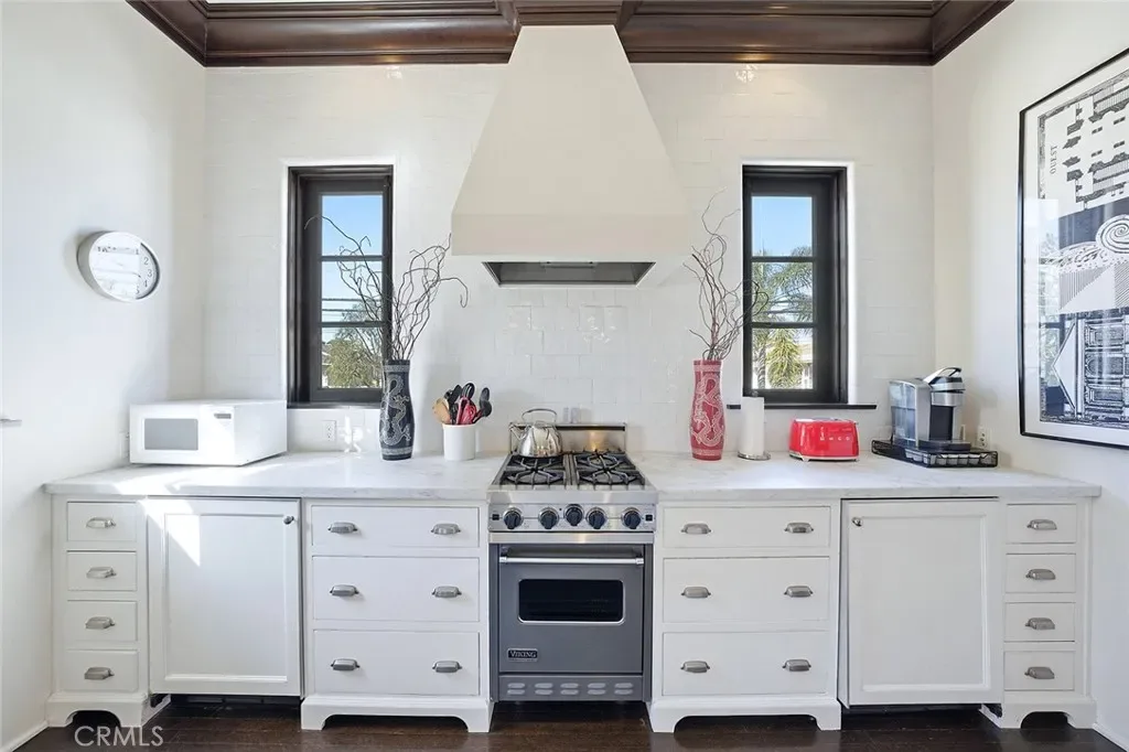 Welcome to one of Long Beach’s most iconic and architecturally significant residences- a timeless Italian Renaissance estate originally built in 1921, and masterfully reimagined with modern luxury and refinement. Spanning approximately 5,173 square feet in the main residence, complemented by an 861 square foot guest house, this extraordinary property blends old-world craftsmanship with elevated contemporary living. Every detail has been thoughtfully curated, from imported Italian limestone and terra cotta finishes to hand-forged wrought iron, coffered ceilings, and custom millwork throughout. The main home features 4 spacious bedrooms, each with en-suite baths, along with multiple living and entertaining spaces designed for both grand-scale hosting and intimate everyday living. Five fireplaces add warmth and ambiance throughout, while the lower level offers a true entertainer’s retreat complete with a full bar, home theatre, and an impressive wine cellar. The gourmet kitchen is a chef’s statement, outfitted with custom cabinetry, premium stone surfaces, a 60” Wolf range and double oven, Sub-Zero appliances, and artisan finishes that seamlessly blend function and design. Step outside to a private resort-style setting, where lush landscaping, mature trees, and curated outdoor living spaces create a serene escape. The addition of a built-in BBQ and smoker enhances the outdoor entertaining experience, while the grounds remain thoughtfully designed with potential for a future pool. Above the four-car garage, the guest house offers a private one-bedroom suite with full kitchen and living space: ideal for extended family, guests, or additional flexibility. The garage is equipped with a Tesla charging station, and the home includes added convenience with LG washer, dryer, and refrigerator. Located just one block from Ocean Boulevard, this exceptional estate offers close proximity to the beach, Belmont Shore, and some of Long Beach’s most coveted dining and lifestyle amenities. A rare offering that embodies architectural integrity, scale, and timeless elegance, this is truly one of the premier estates in Long Beach.