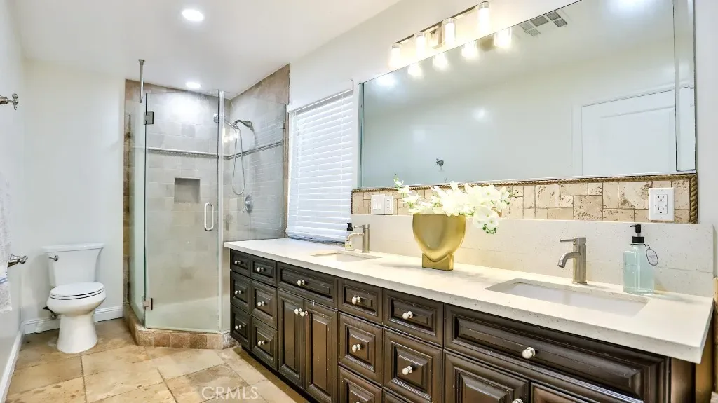 The primary suite is a true retreat, complete with a spa-caliber bath featuring a Jacuzzi soaking tub, full tile surrounds, and expansive walk-in closets designed for both function and indulgence.