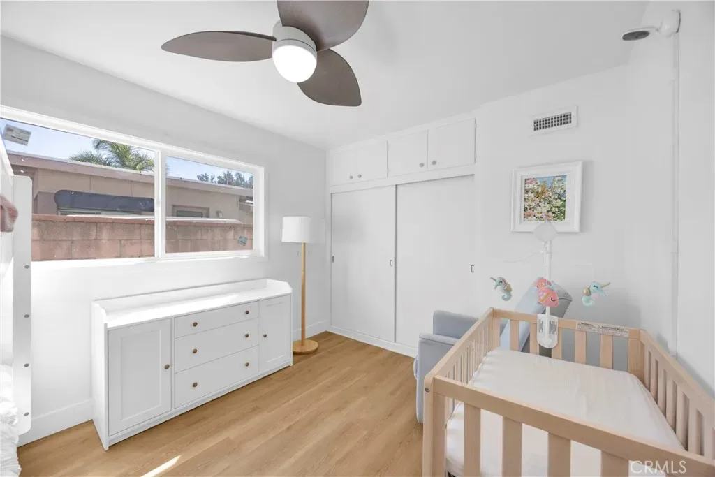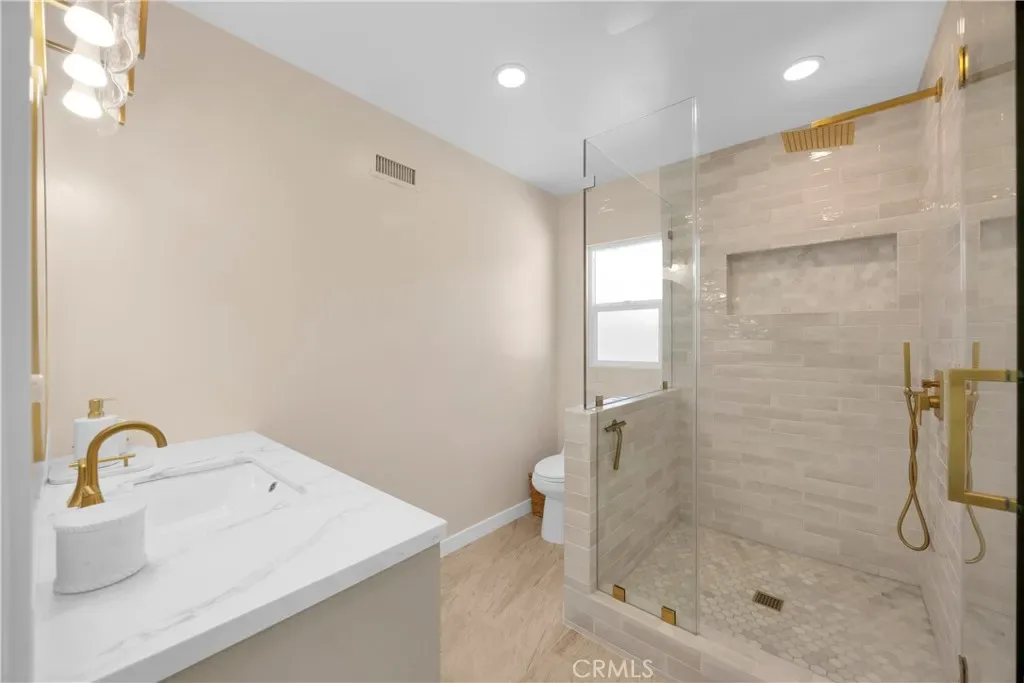 The private primary suite is positioned at the rear of the home and includes a walk-in closet and a beautifully remodeled en-suite bathroom with custom tile and modern fixtures. Both bathrooms have been tastefully updated to match the home’s clean, modern aesthetic.