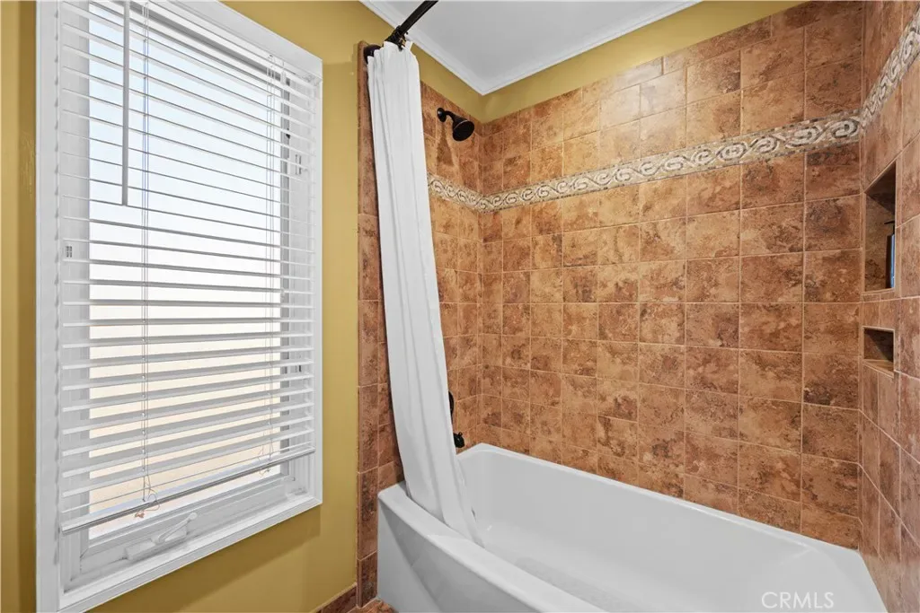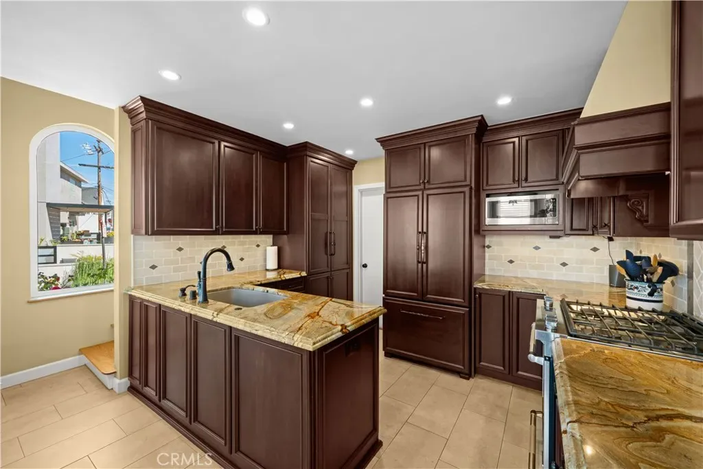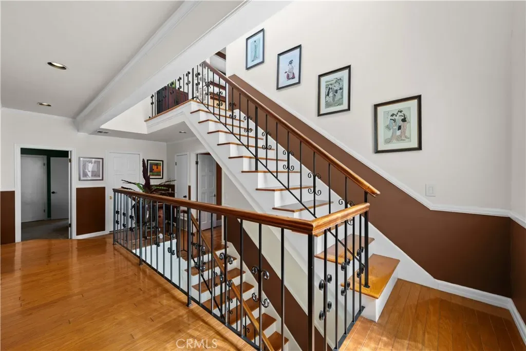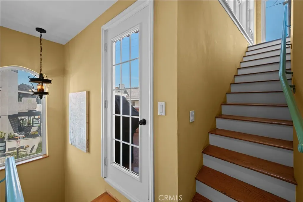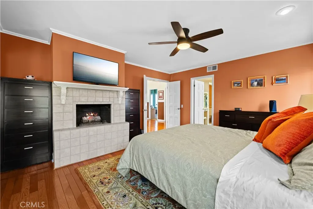 First floor also has a spacious 3/4 powder room with vanity, wood cabinets, crown moldings, a timeless chandelier and travertine flooring. A Guest room next to the bath, has wood flooring, coved ceilings and mirrored wardrobe doors. Next to this guest bedroom is the first level Family room or Den, complete with wood cabinetry built-ins, TV, wood flooring and a sliding door. Then moving upstairs on the open staircase with wood treads, you arrive on the second floor landing. There is a full office and complete with built in desks and storage closet, vaulted ceilings and carpet. There is a Guest bath with tub shower, tile and flooring and porcelain counters, and wood vanity. Guest bedroom number two has mirrored closets doors, carpet flooring, crown moldings and a view patio. There is an upstairs laundry room complete with washer and dryer that will stay with the property. Enter the Primary suite through double doors with hardwood flooring, Fireplace, Crown moldings, mirrored closet doors, light and bright with large oversized windows for maximum light. The beautiful and elegant Primary bath has marble counters, beveled mirrors vanities, Jacuzzi tub, cabinetry is built in furniture grade, plus tile flooring and a clear glass spacious shower. Moving up to the Third floor level, there is a Bonus game room with wet Bar, powder room, panoramic canal and neighborhood views and with a private patio. Finally, for the ultimate in panoramic views of Naples, Catalina Island and Palos Verdes, enjoy the roof top deck from the tallest home in the area.