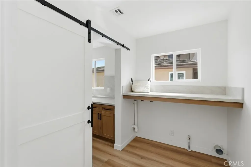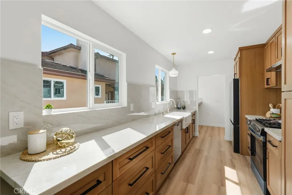 Welcome to 6926 e Peabody. Step inside to appreciate its transformation. You will enjoy the natural light pouring in from the large living room window, luxury vinyl flooring, and recessed lighting, creating a warm and welcoming space to entertain. The dining area chandelier complements the natural tones of the soft-closing drawers, cabinets, and quartz countertops in the remodeled kitchen, which connects to the laundry space, separated by a barn door. The primary bedroom suite includes indoor-outdoor living, with French Doors leading out to a covered back patio. The two bedrooms down the hall have recessed lighting and spacious closets. The backyard includes a finished two-car garage with epoxy flooring, a large covered porch with an outdoor kitchen, new grass, and a permitted den with a powder room, offering the new owner plenty of possibilities for their remodeled home. From the solar, the home remodel, AC, the beautiful outdoor space, and the location, we are excited to bring you this Long Beach home.