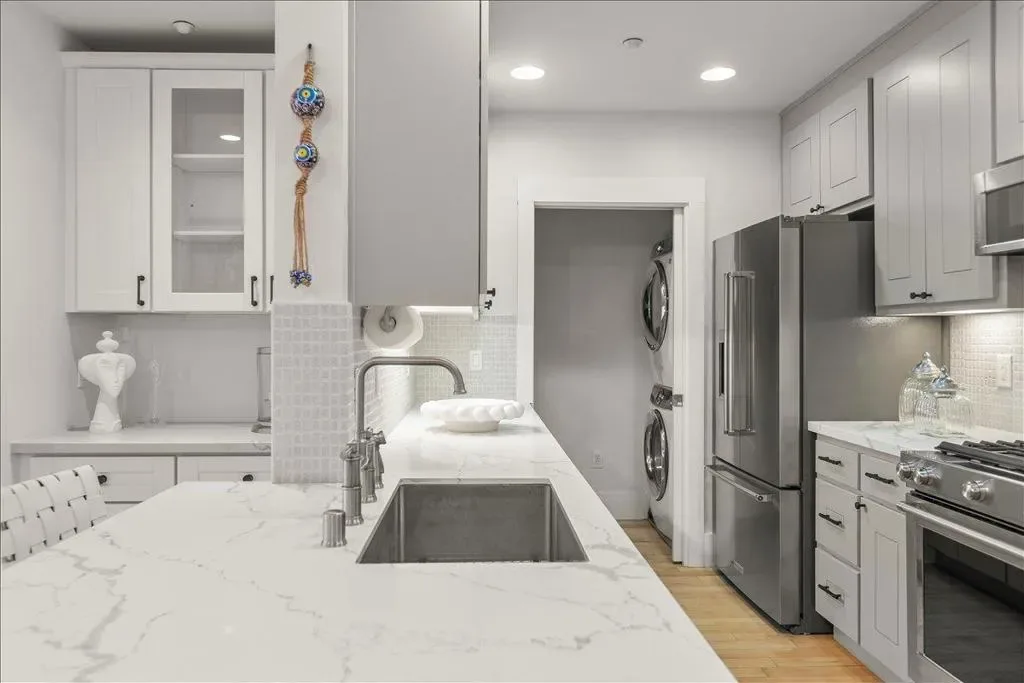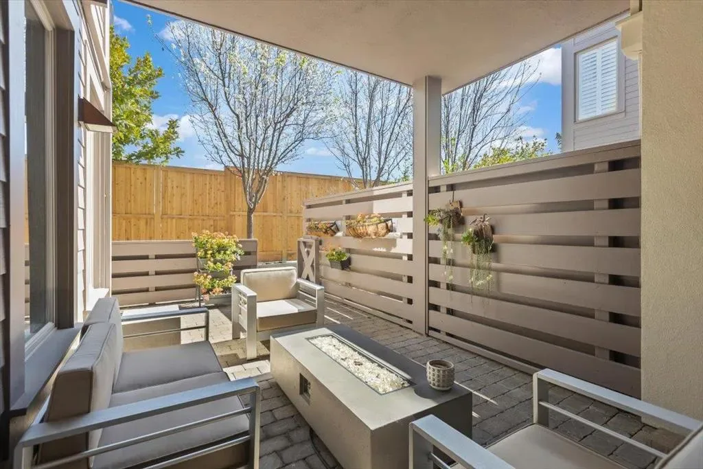 Welcome to 5100 El Camino Real #108, property provides a very nice and newer condominium home with a large wrap-around 735 SF of patio, in great and private location on first floor. This desirable house alternative, well priced for family want to enroll in Los Altos excellent schools. Beautifully remodeled in like new condition, this stunning home includes a spacious floor plan and wrap-around patio. Perfect for play and entertaining. Stainless steel quality appliances. Elegant living room with double side fireplace, recessed lighting and hardwood floor. Spacious dining area with designer light fixture, expansive windows and French door accessing two doors to wrap-around patio with gas firepit. Master suite with high ceiling and walk-in closet with built-in organizers. Additional features: in unit washer/dryer, dual pane windows, hardwood floor throughout and two underground secure parking spaces. The gorgeous, light-filled home provides privacy and convenience, with dramatic nearly 10 foot ceilings. HOA well maintained and building kept in sparkling condition.