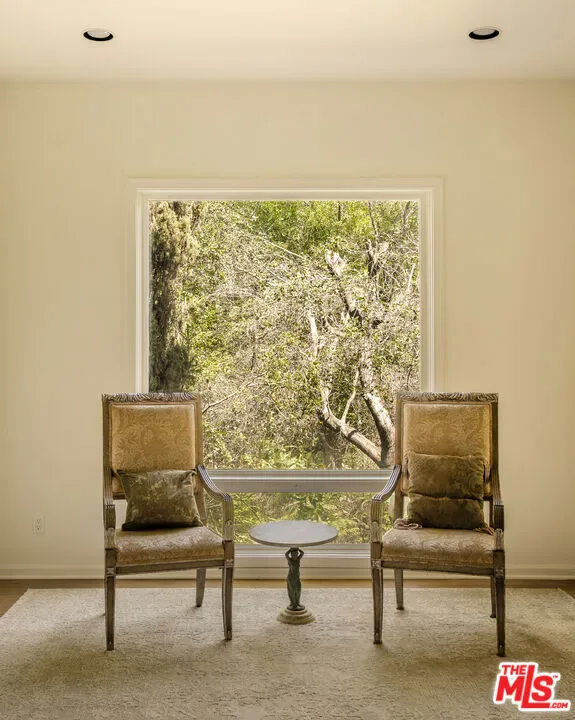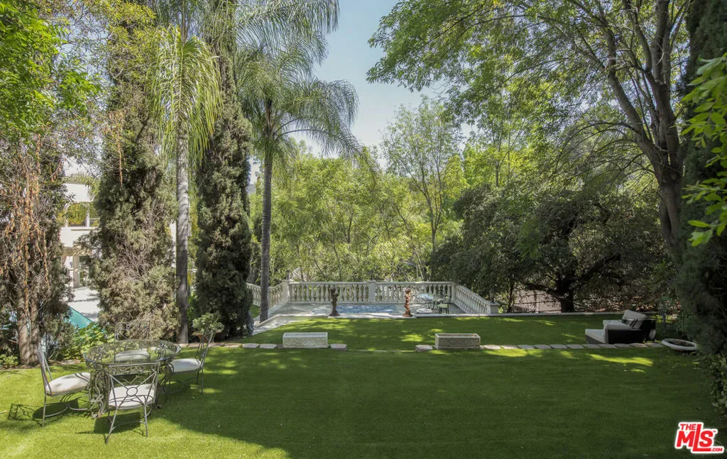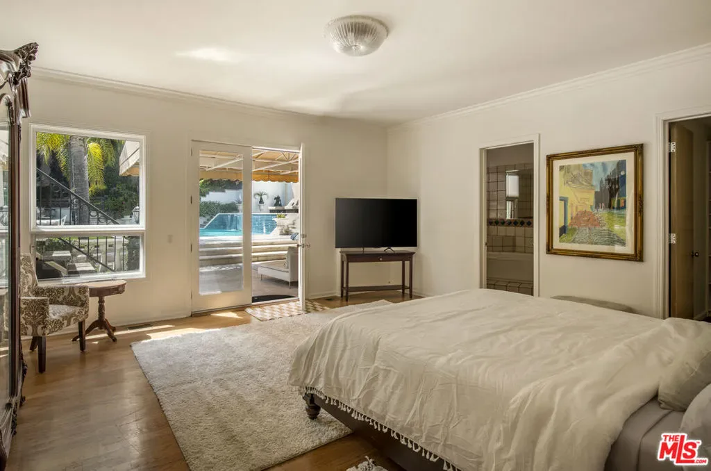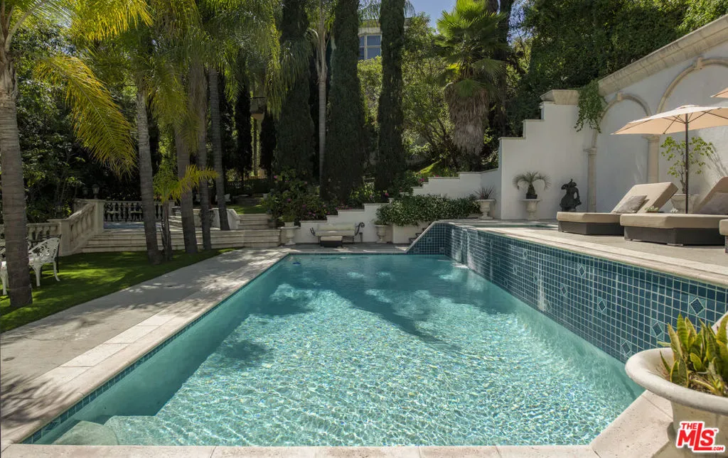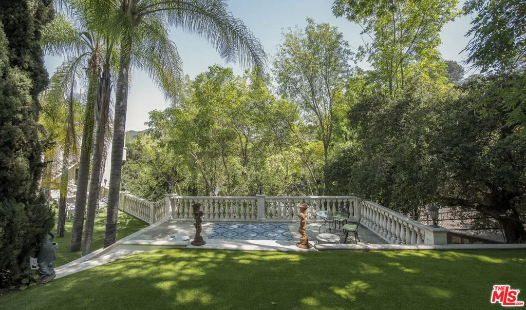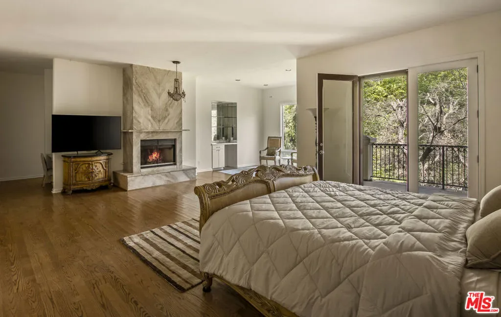 Privately gated at the end of a quiet cul-de-sac, this custom Mediterranean estate sits on an almost one-acre usable lot in the heart of the Hollywood Hills. A dramatic motor court and lush, resort-like grounds create an immediate sense of arrival, with sweeping views, a sparkling pool and spa, waterfall, and a white Italian gazebo setting a serene backdrop for entertaining.Spanning over 5,000 square feet, the home offers 5 bedrooms and 6 baths with soaring ceilings, warm maple floors, and beautifully scaled living spaces. Sunlit living and family rooms are divided by a dual fireplace and full bar, while the gourmet kitchen with generous breakfast area flows effortlessly into the formal dining room.The lower level is anchored by a luxurious primary suite with fireplace, private balcony, spa bath, and expansive walk-in wardrobe. Two oversized guest suites open directly to the pool, complemented by a separate office/library wing and maid’s quarters. Complete with a 3-car garage and sauna, this private estate offers exceptional scale and versatility just minutes from Universal Studios and the best of Los Angeles.
