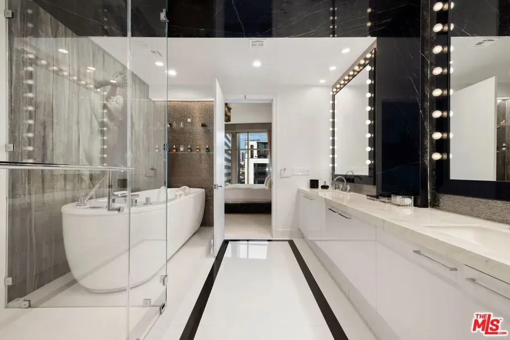 Residence 403 at The Carlyle offers a rare blend of privacy, design, and full-service luxury living within one of Los Angeles’ most iconic buildings. Completely remodeled and offered fully furnished with custom pieces from Roche Bobois and Visionnaire, this residence is accessed by a private elevator foyer that opens directly into expansive living and dining spaces with nearly eleven-foot ceilings, rich wood flooring, custom built-ins, and a striking onyx fireplace. The chef’s kitchen features Sub-Zero and Miele appliances, a dedicated espresso station, and a Snaidero design highlighted by a dramatic Panda marble waterfall island. The primary suite is designed as a private retreat with an oversized custom walk-in closet and a spa-inspired bath showcasing an Unbescheiden soaking tub imported from Germany, sculptural stone surfaces, TOTO toilets, and Swarovski crystal fixtures. Additional highlights include a private salon and wellness suite with infrared and traditional saunas, advanced European spa technologies, and a fully soundproofed professional recording and production studio. The residence is equipped with a fully integrated smart home system, surround sound, and security. Building amenities include 24-hour concierge and valet, a residents’ lounge by Fendi Casa, a fitness center with Pilates reformer, a temperature-controlled wine cellar with private lockers and dining room, a landscaped outdoor terrace with pool and spa, and dedicated on-site staff. Ideally located along the Wilshire Corridor near UCLA, Beverly Hills, Bel Air, and Santa Monica.