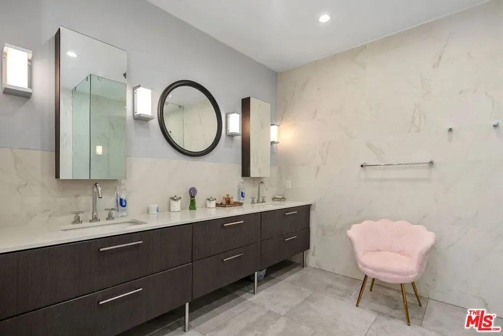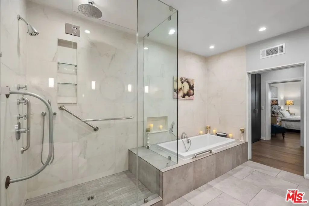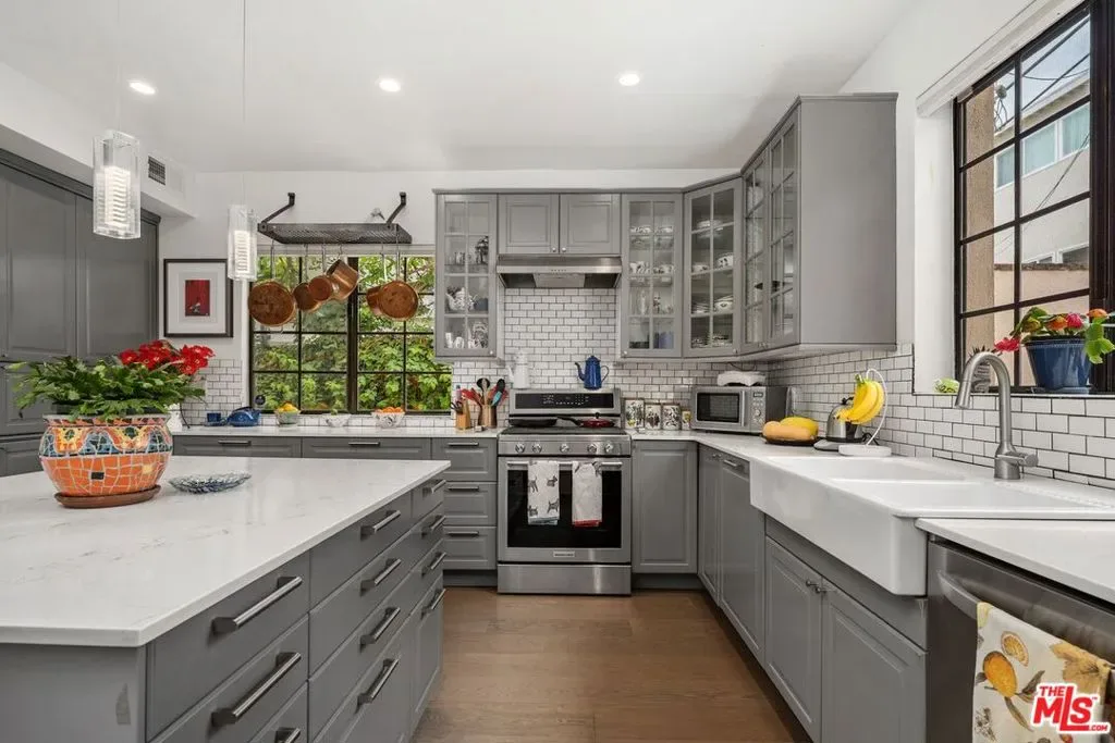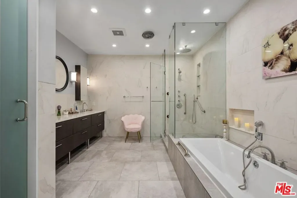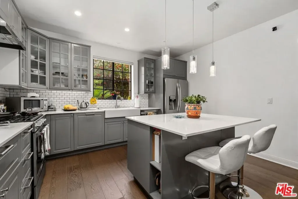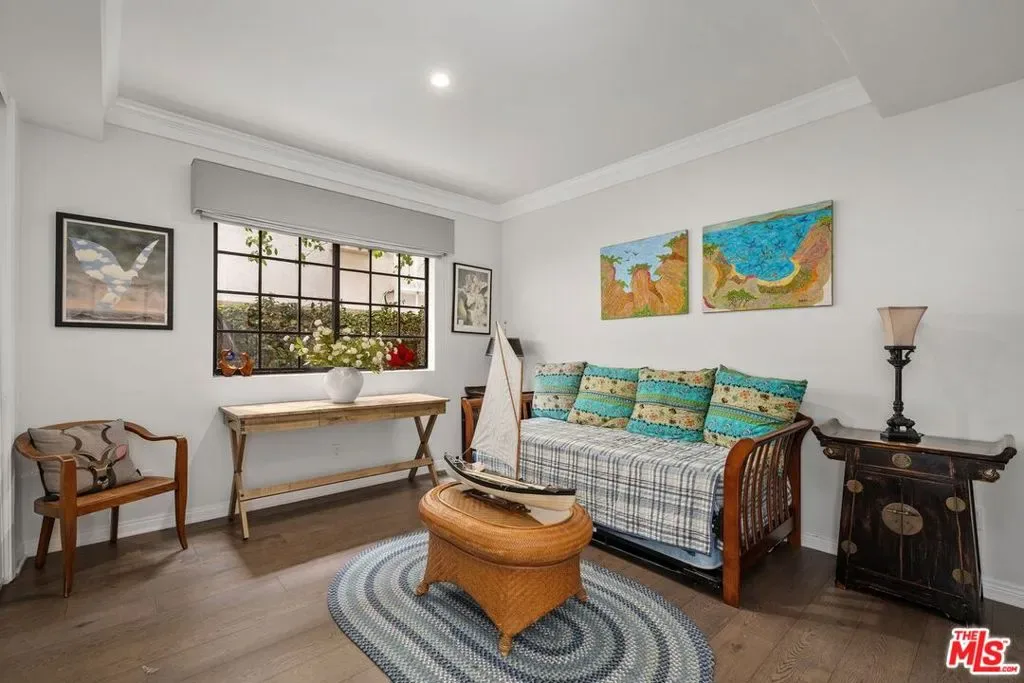 Discover this spacious, single-level home in the heart of Brentwood . . This 2 (+ 3rd bed / office – with closet) bedroom, 2.5 bath, 2300+/- sq foot corner unit boasts generous room sizes, custom Roman Shades, nearly 9-foot ceilings, wide-plank, wood floors and dimmable recessed lighting throughout. . . just steps to the many shops & restaurants of Brentwood Village. Come in through the elegant double-door entry. Everything in this unit is on a grand scale and feels like a single family home. The enormous living/country dining room has a working fireplace, plenty of room for a grand piano and opens to a spacious, private patio (with brand new flooring) with lots of room for several seating areas. The extra-large cooks kitchen features glass-front cabinetry, a breakfast bar, built-in wine rack, stainless appliances (including an LG ThinQ smart refrigerator and LG dishwasher, new circa 2023), farmhouse double sink, center island, windows facing two directions, under-cabinet lighting and seeming endless storage. Huge primary suite includes a ceiling fan, custom closet with jewelry drawers. Sumptuous bath with dual sinks, a separate soaking tub with wide surround (perfect for candles) & over-size, frameless shower enclosure with body-washer. Good size secondary bedroom with an entire wall of closets. Third bedroom/office with built-ins and closet. Good size laundry room with generous storage and shelving. Huge linen closet in hallway. This building was built as condos. Building garage is at street level. No stairs from garage to elevator to unit floor . . . . Please see “Doc(s)” link (above) for additional HOA information. Please see the “Virtual Tour” link (above) for the self-directed, 3-D virtual tour.