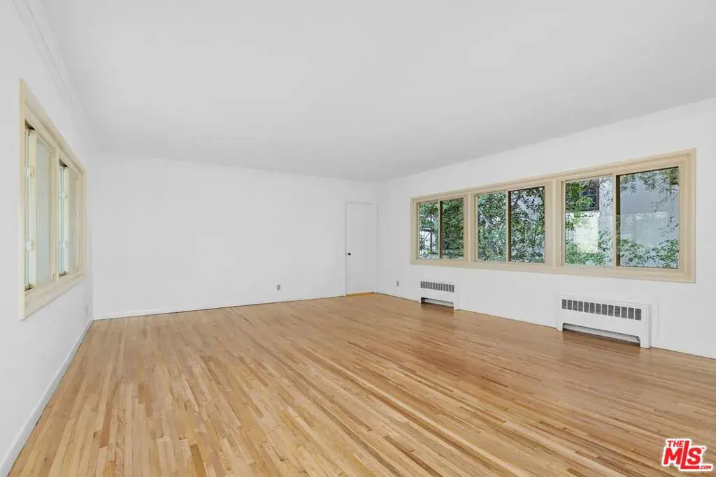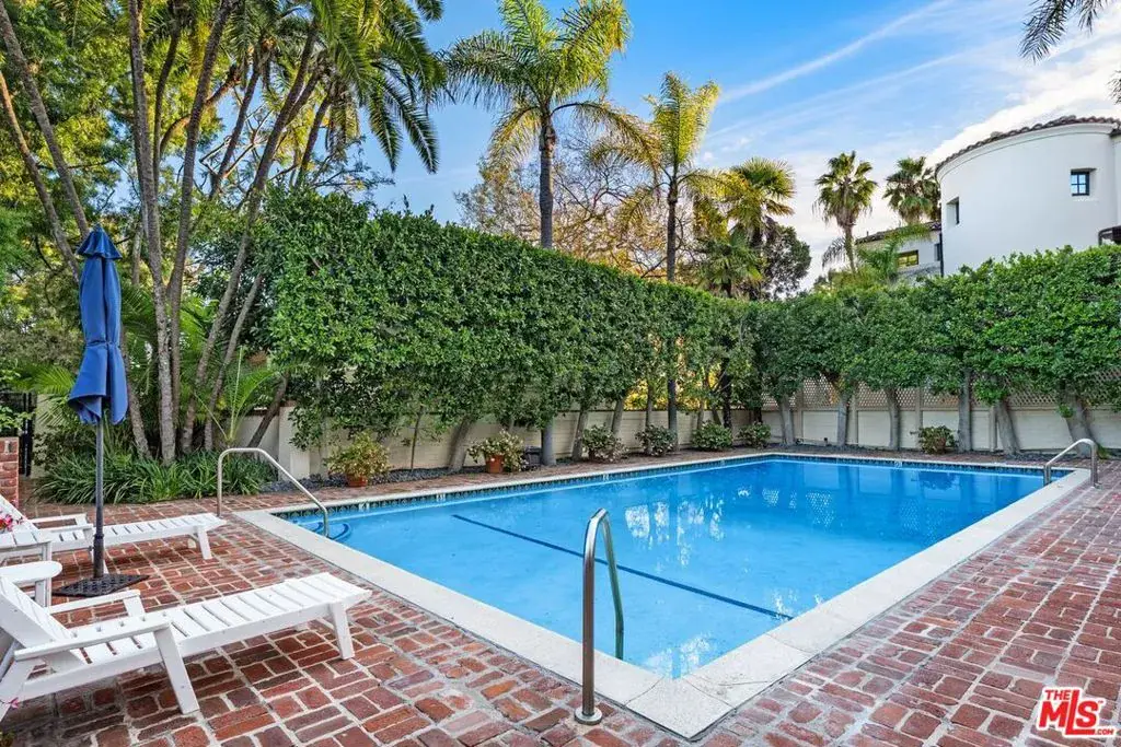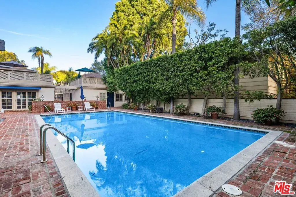 Exceptionally spacious top floor, 1 bedroom 1bathroom unit in classic mid-century California garden courtyard complex. Built in 1950 and spreads over 2.1 acres of lush landscaping, trees and quiet walkways with gardens. Unit #206 is located at the Northwest corner of this tranquil complex. A unique front entry balcony offers privacy along with a serene view of the surrounding trees and central garden. Original and newly refinished hardwood floors and freshly painted. The bathroom has separate shower and tub. Eat in kitchen with large window and back entrance from private porch surrounded by trees. The expansive windows showcase lush landscaping, creating a peaceful treehouse-ambiance. 2-car garage. Community Laundry, but other owners have installed washer & dryers in their unit. Close to Brentwood Village, San Vicente Shops & Restaurants, Dog park & Barrington Rec Center! HOA dues include gas, water, heating, and earthquake insurance. Complex amenities include a heated saltwater pool, whirlpool hot tub, fitness center, and guest parking.