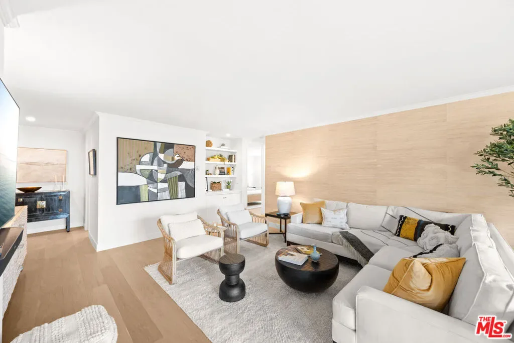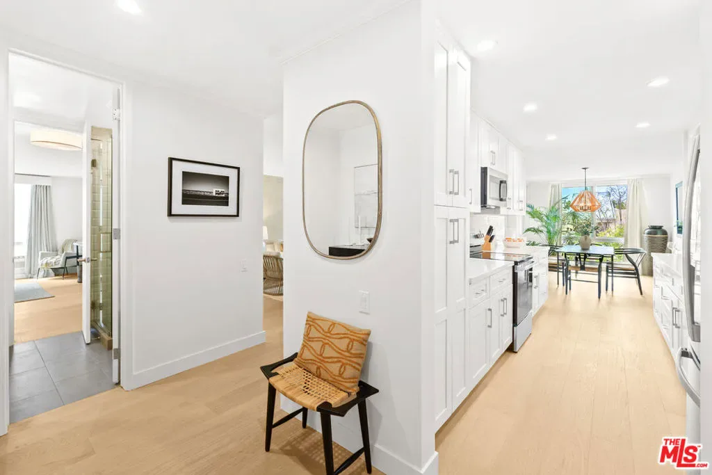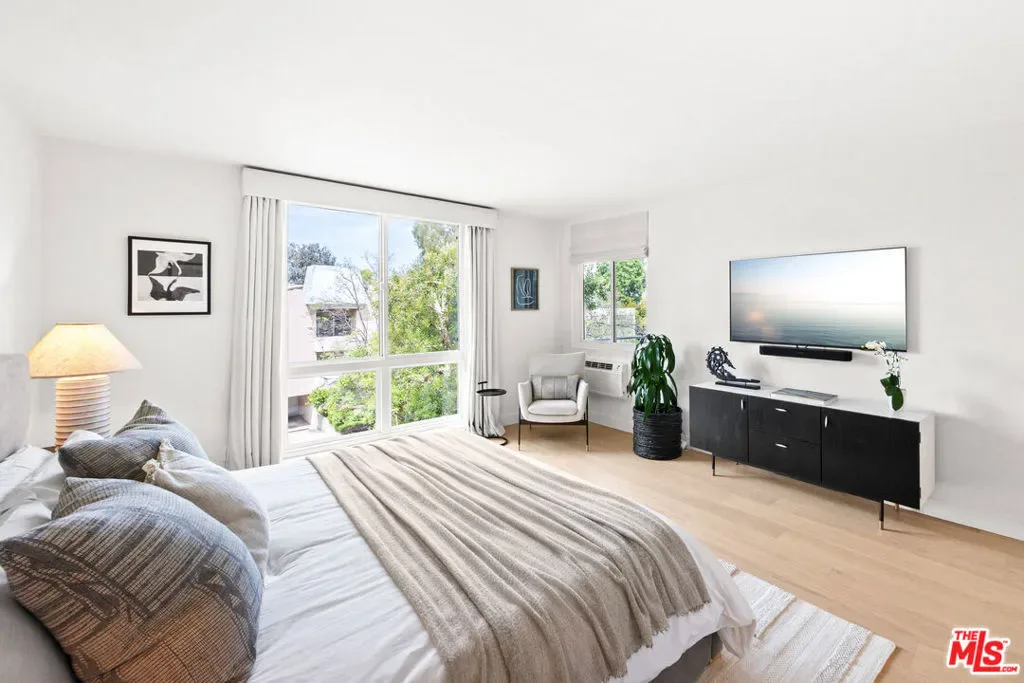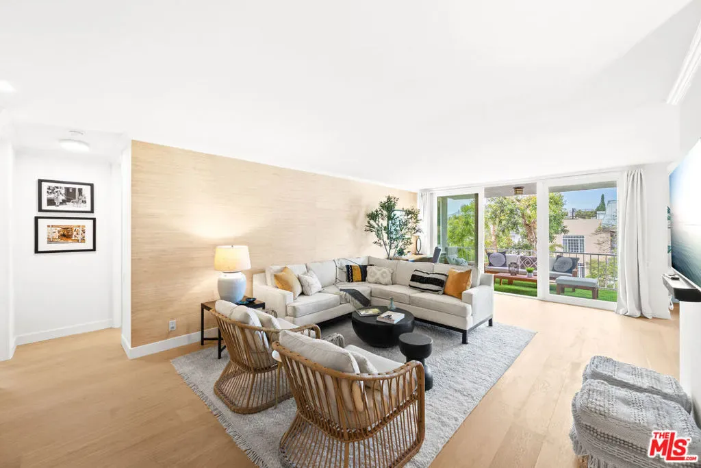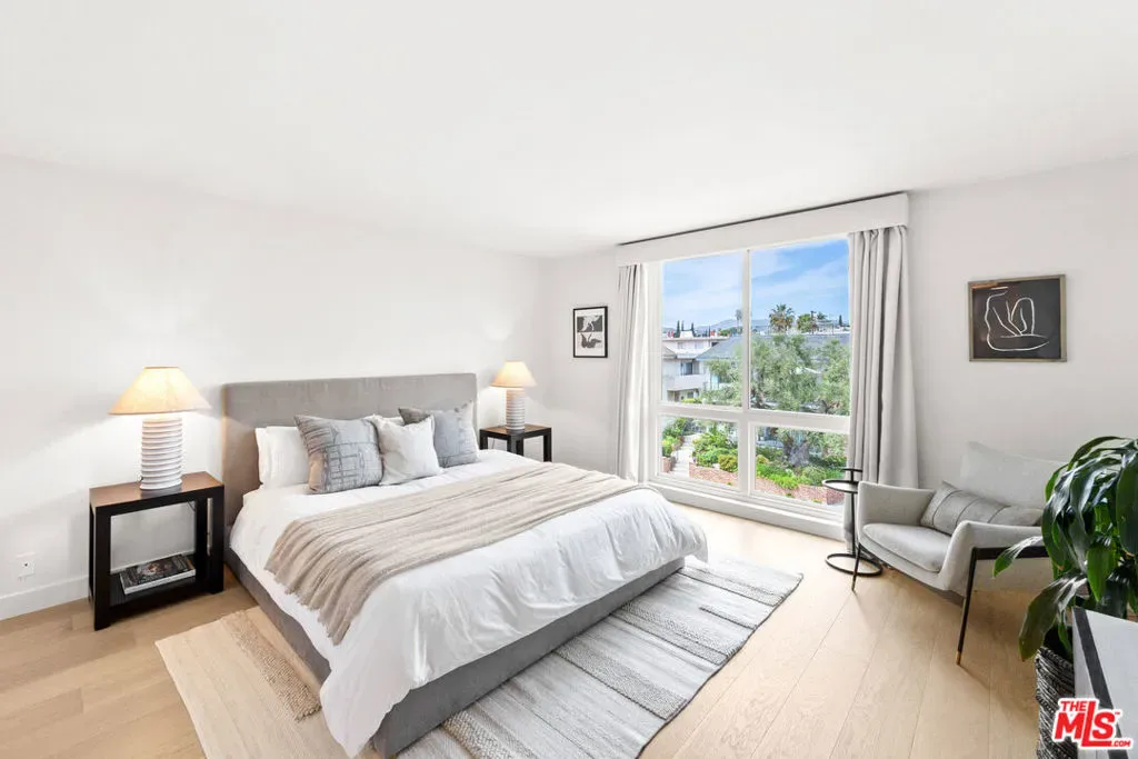Welcome to 11918 Kiowa #201, a beautifully updated, front-facing residence offering refined luxury and effortless sophistication in the heart of Brentwood. Surrounded by tranquil, tree-lined vistas and blooming jacarandas, this elegant 2-bedroom, 2-bath condominium blends serenity with vibrant city living. Bathed in natural light, the open-concept floor plan is framed by floor-to-ceiling double-pane windows and enhanced by newly installed wood flooring, creating a seamless indoor-outdoor experience. The spacious living area opens to an oversized private balcony, offering a peaceful outdoor setting ideal for morning coffee, unwinding in the evening, or enjoying quiet moments throughout the day. The designer kitchen features custom white cabinetry, pull-out storage, quartz countertops, custom lighting, and new stainless-steel appliances, flowing into a generous dining area ideal for both intimate dinners and effortless entertaining. The primary suite offers a calming, elevated ambiance with views of surrounding treetops and overlooks the inviting private balcony, complemented by a walk-in closet and a spa-inspired bath with soaking tub and shower. The secondary bedroom is thoughtfully positioned for privacy and features generous closet space, along with a beautifully updated en-suite bathroom with refined finishes, creating a welcoming retreat for guests or a sophisticated home office. Additional features include in-unit laundry, a formal double-door entry, two side-by-side parking spaces, and abundant storage. Residents enjoy a well-maintained building with controlled access, elevator service, a renovated lobby and recreation room, secure garage parking, lush landscaping, and earthquake insurance. Perfectly situated with a Walk Score of 88, just moments from Brentwood’s premier dining, boutiques, and everyday conveniences along Wilshire and San Vicente, this home offers an exceptional blend of comfort, style, and location.