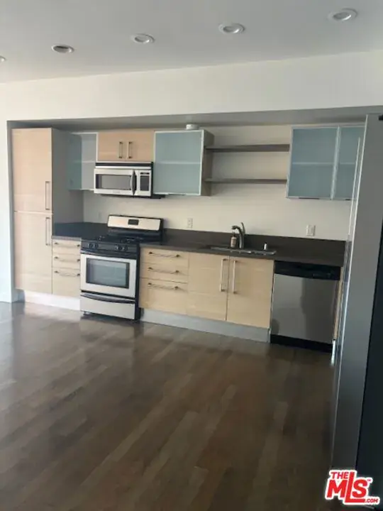 South-facing top-floor unit features an open-concept floor plan with tons of natural light, hardwood floors in the Bedroom and Living room area, a European-style kitchen with Caesarstone counters, a bedroom with dual closets, and a spacious full bathroom. The unit located at the rear of the building protects from heavy traffic noise and provides privacy. This Vero community offers 24-hour concierge/ security services, a resort-style pool and spa, a top-rated fitness center featuring a yoga studio and sauna, and a resident library and club room. Located just minutes from LA Live, Staples Center, Financial District, Koreatown, and a wide variety of dining, shopping, and entertainment venues with convenient freeway access. Central A/C, 22-car tandem parking, Washer& Dryer, Refrigerator. Please email PEAD-V before showing and follow CDC / Local Authority guidelines.