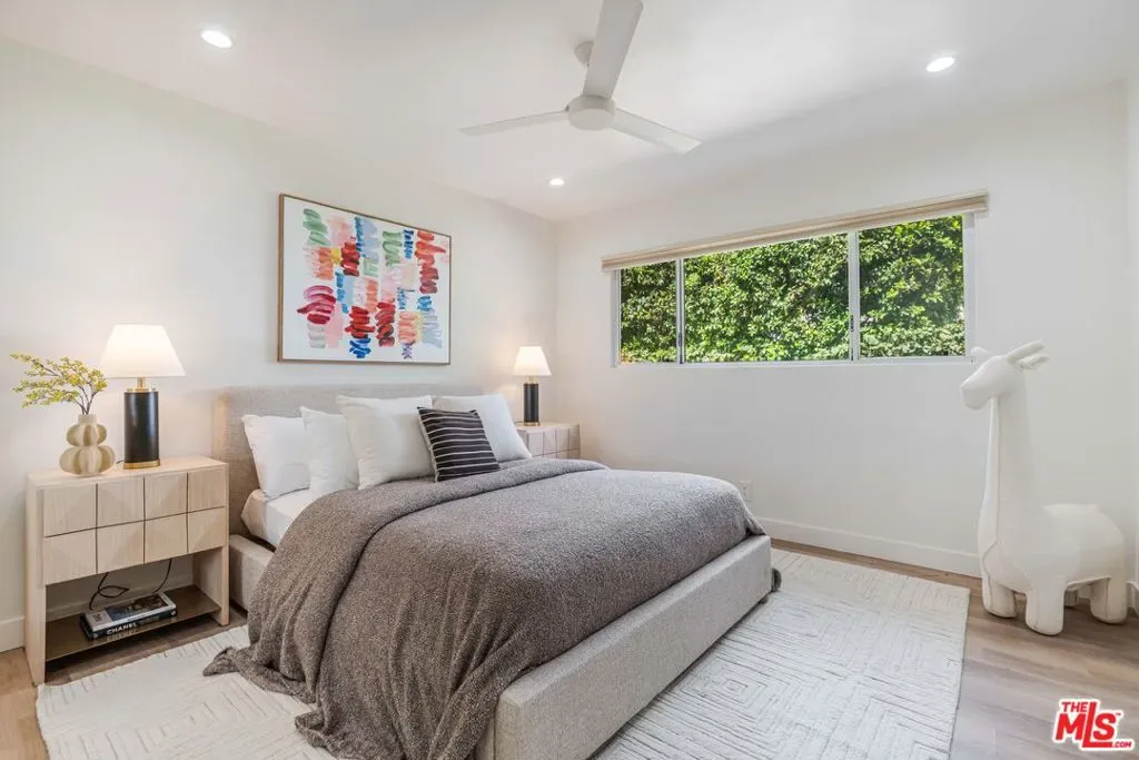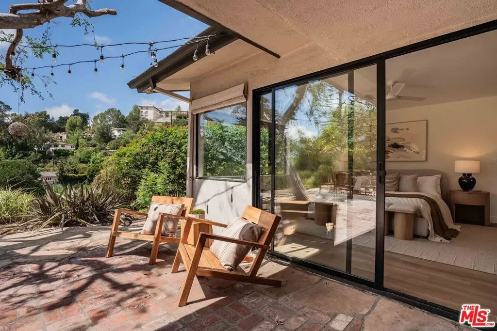 Stunning single-level Mid-Century Modern home situated at the end of a quiet cul-de-sac in the heart of Brentwood. This newly renovated 4-bedroom, 4-bath residence offers nearly 3,000 SF of light-filled living space on an expansive 3/4 acre double lot spanning over 32,000 square feet. A bright, open floor plan showcases a refined minimalist aesthetic with abundant natural light and seamless indoor-outdoor flow. The living room is anchored by a striking stone wall and dual-sided fireplace. Glass sliding doors open to a spectacular backyard retreat with sweeping hillside and canyon views. The dining room features a dramatic curved glass wall, enhancing the home’s architectural appeal. The kitchen is thoughtfully designed with beautiful bay windows, custom cabinetry, granite countertops, ample storage and a charming breakfast area. The primary suite offers serene views, a private outdoor seating area, and spa-like bathroom with double vanity and oversized shower. What sets this property apart is the exceptional outdoor space. The oversized lot provides incredible privacy and serves as a blank canvas with endless potential. Ideal for a pool, guest house, sports court, lush lawn and customized outdoor living spaces. This large mostly flat lot has significant upside potential for future house expansion and development of outdoor amenities. Additional features include a full laundry room, attached 2-car garage with direct entry and fully-owned solar panels. Located in a peaceful and private setting with no homes across the street, only a quiet hillside just below the iconic Getty Museum. A rare opportunity to own a move-in ready modern home combining timeless design, privacy, and extraordinary potential.