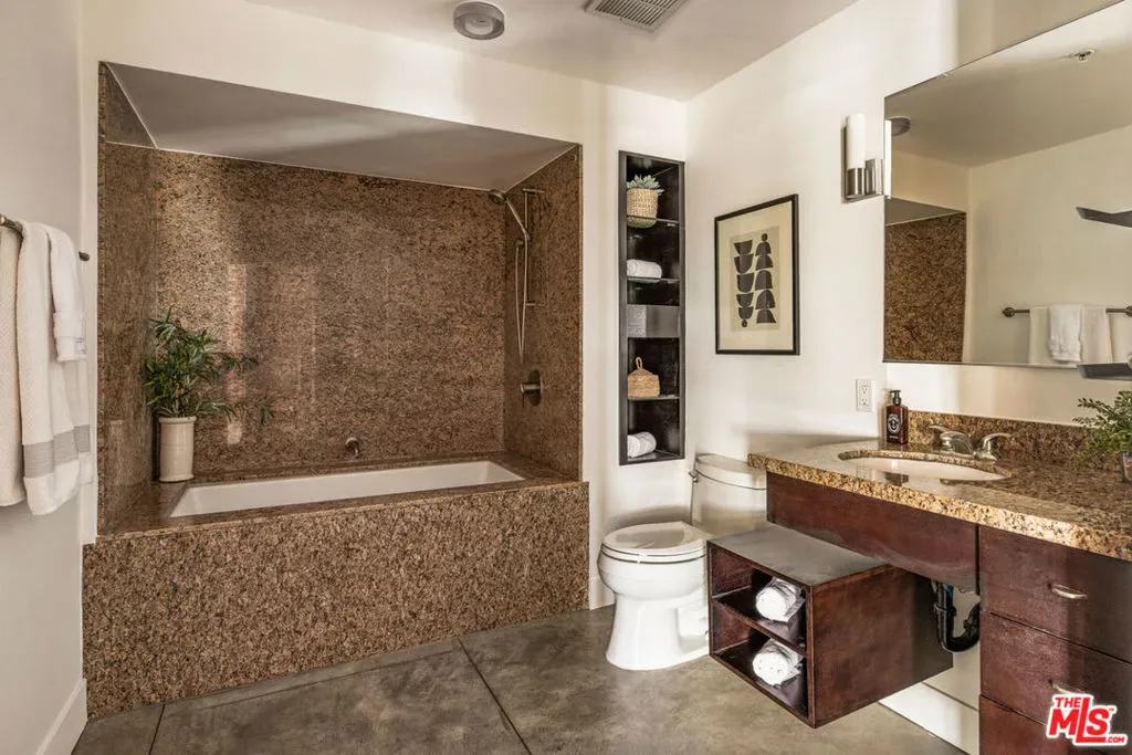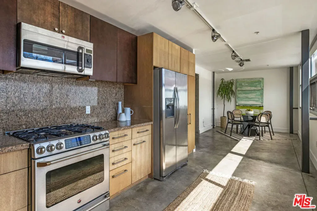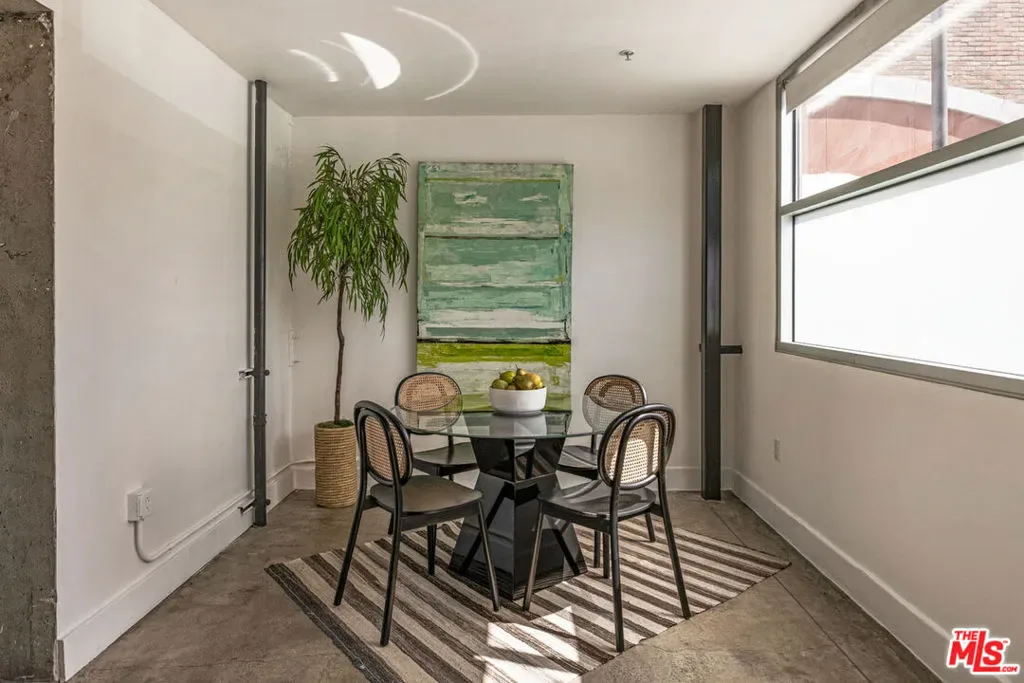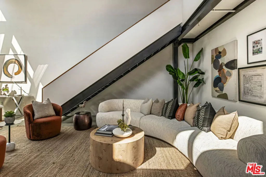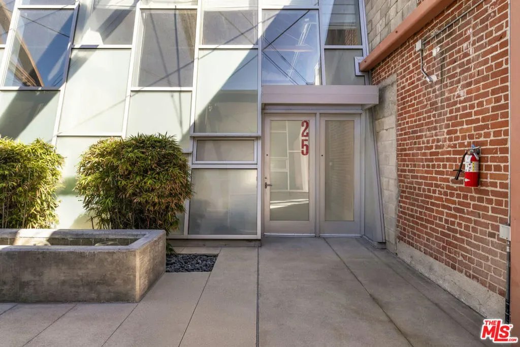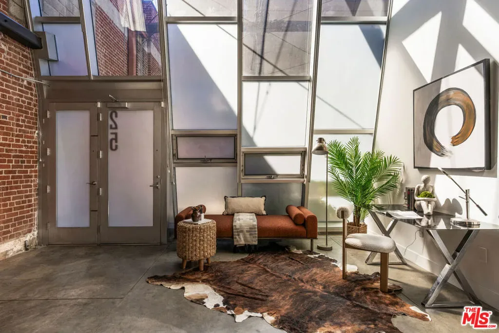 Your opportunity to own a striking front unit at Gallery Lofts, an architectural gem in the heart of the Arts District. This refreshed loft celebrates industrial design with soaring ceilings, timber trusses, exposed brick walls, and massive steel-framed windows flooding the space with natural light. Expansive open floor provides considered separation between kitchen, dining, and living areas; polished concrete floors flow throughout. The sunny kitchen is appointed with a full backsplash, wood cabinetry, and stainless appliances. A floating mezzanine provides lofted bedroom space; two bathrooms include one on the main level and one upstairs. Amenities include in-unit laundry and AC, gated community access, and one gated parking space. Enjoy great dining and culture right outside your door at Prince Street, Salt & Straw, Yuomi Handroll, Wurstkuche, Hauser & Wirth, and Little Tokyo just one street over.