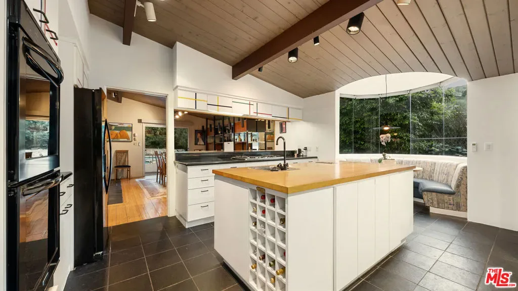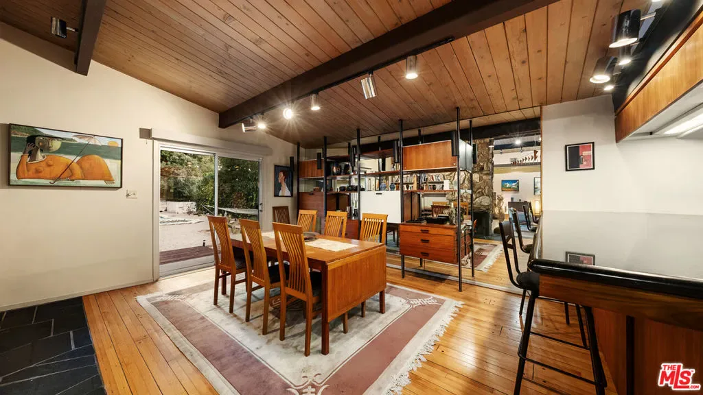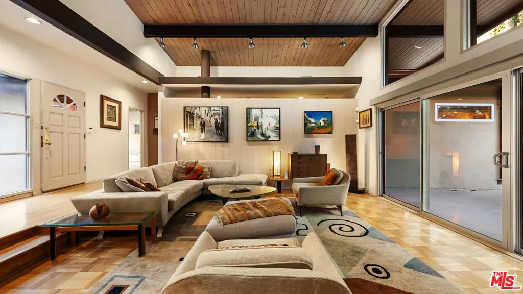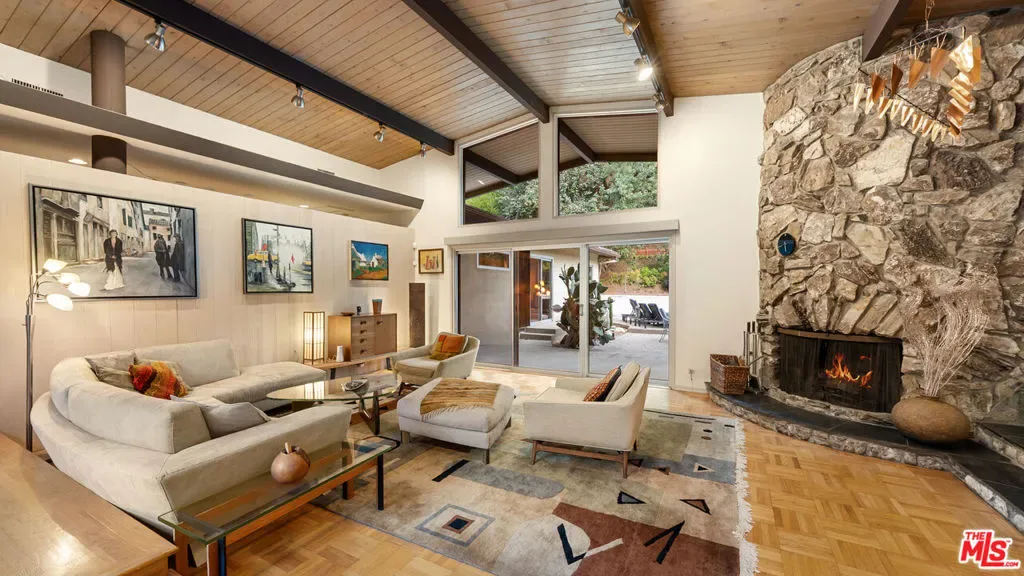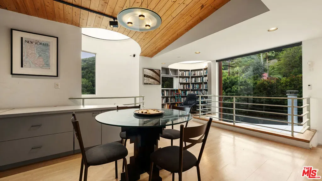A quintessential Mid-Century Modern retreat, privately sited within the tranquil canyon setting of Brentwood’s coveted Upper Mandeville Canyon, this architectural residence, originally built in 1957 and thoughtfully reimagined in collaboration with renowned architect Richard Dodson, A.I.A., embodies the era’s ethos of simplicity, functionality, and harmony with nature on an 18,078 square foot lot. A dramatic post-and-beam entry introduces soaring vaulted ceilings, exposed wood structure, a sculptural stone fireplace, and expansive walls of glass, dissolving the boundary between interior and exterior while framing serene canyon vistas. Clean lines, organic materials, and an open, flowing floor plan create a timeless modernist sensibility throughout. The main living spaces unfold effortlessly, anchored by a formal dining area with a fireplace that transitions into a thoughtfully designed kitchen featuring a generous center island, sleek cabinetry, and a sun-drenched breakfast banquette, an inviting nod to classic mid-century design. The adjoining family room, complete with a third fireplace, custom built-ins, and integrated media, is enveloped in natural light and oriented toward the surrounding landscape. The primary suite serves as a private, resort-like sanctuary, with direct access to the pool and gardens and a spa-inspired bath illuminated by skylights, offering dual vanities, a soaking tub, and a frameless glass shower. An adjoining office or multi-use room enhances the suite’s functionality, while two additional bedrooms and a full bath complete the main level. Upstairs, a glass-wrapped pavilion floats among the treetops, offering sweeping canyon views and remarkable versatility as an additional bedroom suite, creative studio, or media retreat, complete with an additional upstairs full bathroom. A separate library with skylight and private balcony further embraces the home’s connection to light, air, and landscape. Designed for seamless indoor-outdoor living, the grounds feature a solar-heated pool, curated landscaping, and multiple spaces for relaxation and entertaining. Additional amenities include a guest powder room, dedicated laundry, and multi-zone HVAC. A rare offering that captures the spirit of mid-century modern architecture, where form meets function and every space is in dialogue with its natural surroundings, just moments from the best of the Westside.