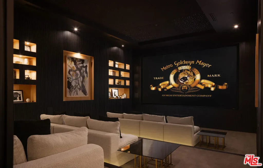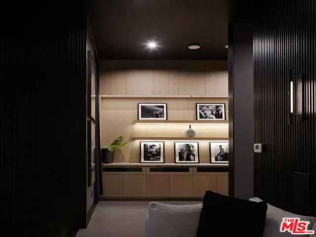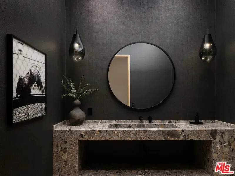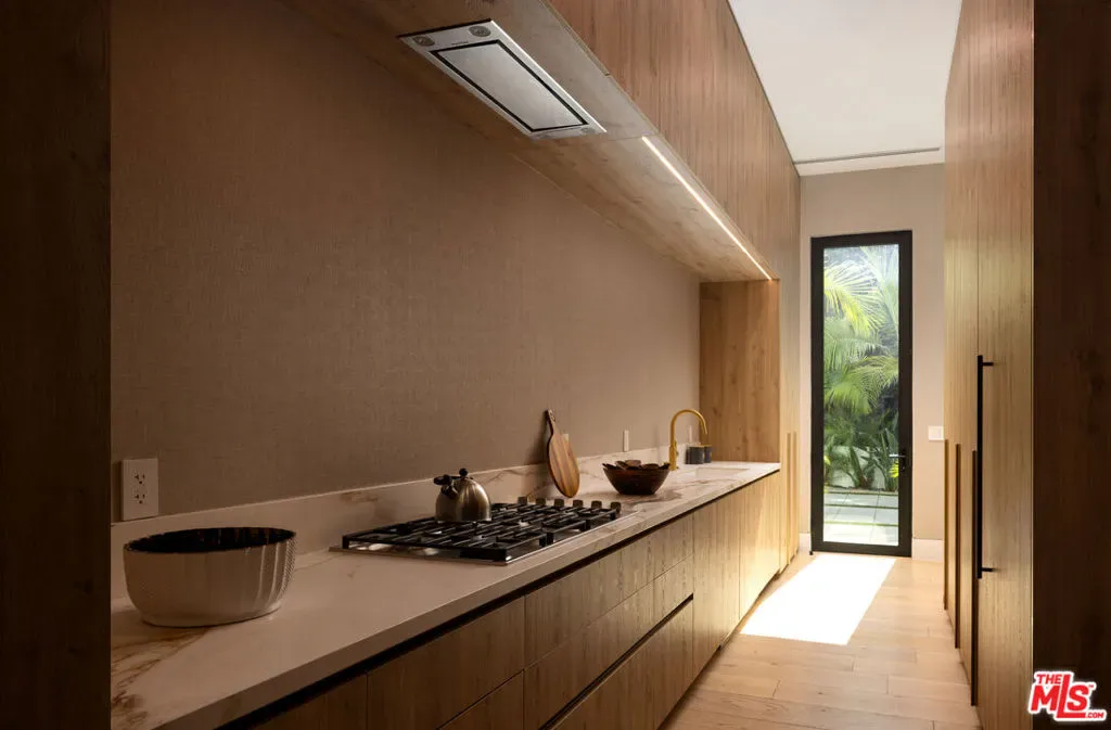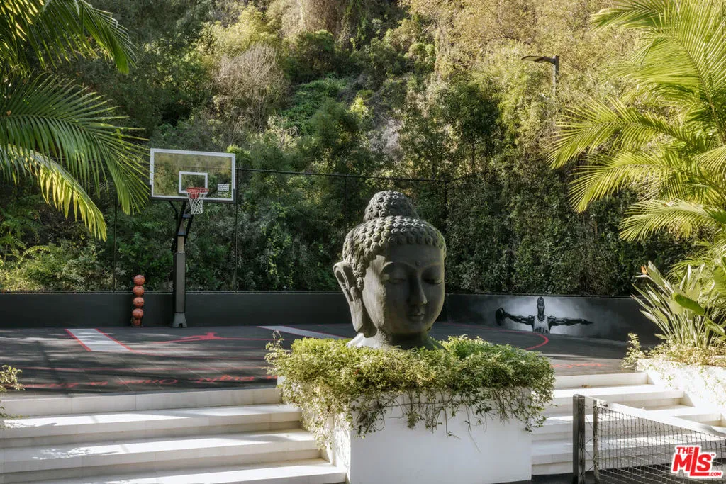An absolute dream for recreational enthusiasts, growing families, and lovers of the al-fresco way of life, this exquisite haven includes a tropical open-air dining room, dedicated pickleball court, a professional-size basketball/sports court, and putting green, all enveloped by a flourishing leafy paradise. Enjoy a casual, fun-filled lifestyle at this private, family-friendly luxury resort that also features a cabana with outdoor kitchen and rainfall curtain, relaxation loggia, a 16-person sunken fire pit with glass view to pool, numerous sitting areas, organic gardens, and 3,000-square-foot rooftop deck optimized for entertaining under California skies. An expansive gated motor court provides parking for ten cars, and a striking entry calms the senses with soft organic tones complementing the lush hillside beyond. A gourmet chef’s kitchen is outfitted with bookmatched stone slabs, triple waterfall island, and Miele appliances as well as a commercial-grade walk-in refrigerator in the caterer’s prep galley. Both bar and wine room are showpiece standouts, and the theatre is expertly configured to match a true cinema experience. Upstairs, the primary wing alone spans 3,000 square feet and offers a lounge, two-sided fireplace, and a marvelous spa-worthy imported European stone-clad bathroom plus dual closet changing rooms, one of which features a walk-out balcony with fire pit overlooking the grounds below. Other amenities include an office, gym, sauna, and mud room. Indulge in an effortless resort-quality lifestyle from this extremely private entertainer’s compound surrounded by natural greenery with sumptuous canyon views, showcasing a variety of premier amenities on 1.3 acres of mostly flat usable land. Secluded in a park-like setting with no immediate neighbors, this ideal estate promises joyful existence and enduring, uninterrupted leisure from one of the most highly sought-after locales in the world. Welcome to the peak of contemporary luxury.
