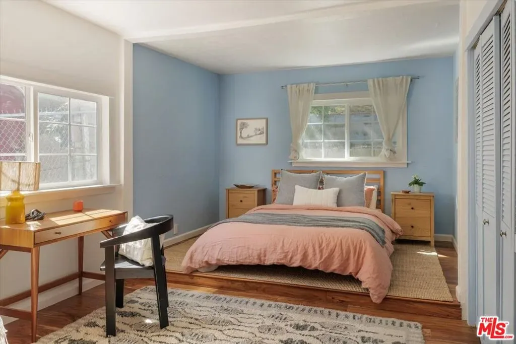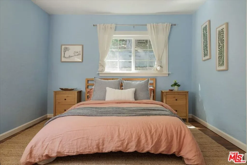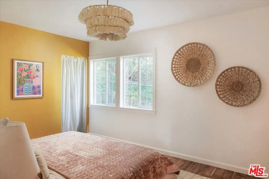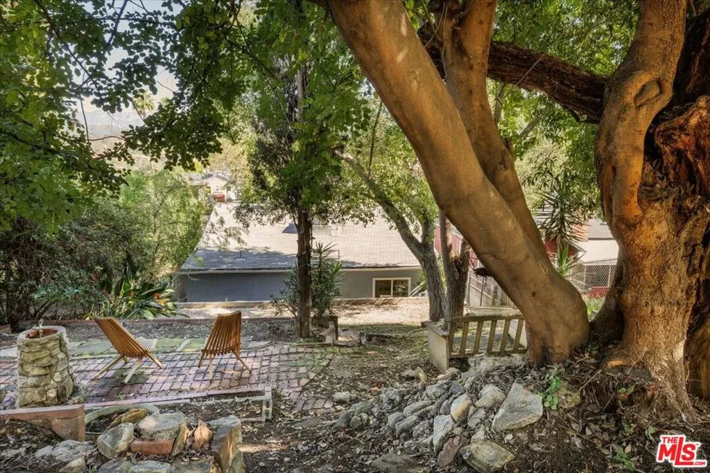 Perched above the street in a verdant pocket of Eagle Rock, and with a welcoming approach, this elevated bungalow offers warmth and personality. A wide staircase leads to an expansive front deck ideal for morning coffee or sunset lounging framed by mature landscaping and layered views. Light-filled and comfortable, the living room blends character with ease, anchored by a colorful mosaic-tiled fireplace as a delightful focal point. The dining area flows seamlessly into an open kitchen featuring concrete countertops, stainless steel appliances, and an artful tile backsplash a stylish yet highly functional heart of the home. The primary bedroom offers a luxe attached bath with dual vanities and a walk-in shower. A versatile and spacious second bedroom easily serves as an office and/or guest room. The hall bath includes a second shower and a classic clawfoot tub, blending vintage character with modern comfort.Beyond the home, a generously sized backyard unfolds as a rare and versatile canvas room to garden, entertain, create, or simply take in the views of the San Gabriel Mountains. A detached garage adds flexibility for parking, storage, or potential creative use. This charming home offers distinctive style, comfort, and a coveted Northeast LA lifestyle.