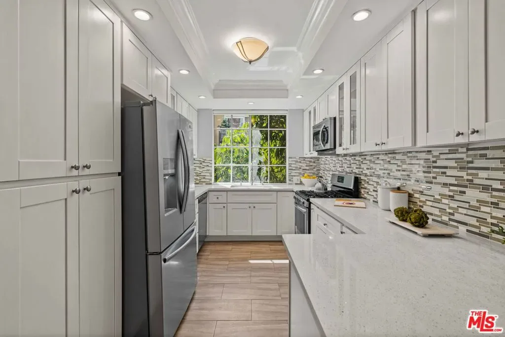 Exquisite and spacious updated one bedroom with west facing windows framing lush greenery views. The living room opens seamlessly to a sunny private patio, perfect for afternoon coffee or evening relaxation. A marble fireplace, built-in bar, recessed lighting and lovely dining area add warmth and sophistication. Gorgeous kitchen with stainless steel appliances, brand-new refrigerator, white quartz countertops, and abundant cabinet storage. The serene master bedroom includes generous closet space, updated shower/ tub and separate vanity area. Throughout the home, beautiful wood floors and crown molding create a timeless, cohesive aesthetic. This quiet home provides private laundry – including stacked washer/dryer; central A/C – new HVAC system installed in 2025; and two parking spaces. Extra storage and guest parking spaces available in the gated security garage. This exceptional community offers a charming landscaped courtyard with running stream, outdoor pool, spa, and gym. Located on a quiet street in the most desirable Westwood neighborhood, this home is just moments away from shopping, restaurants, parks and the UCLA campus.