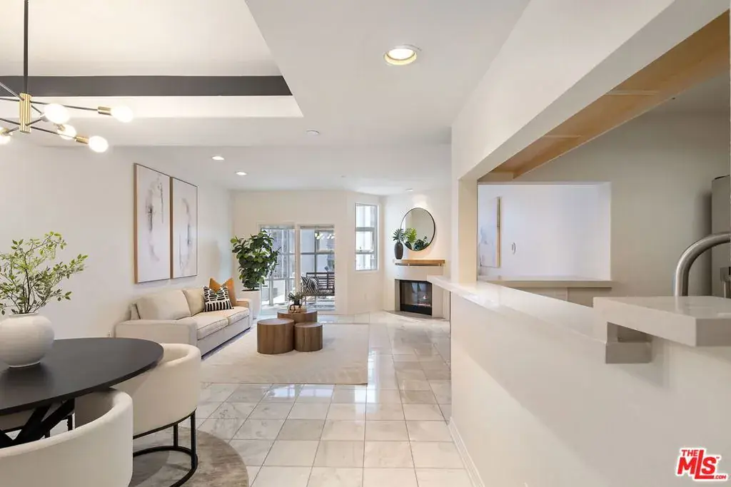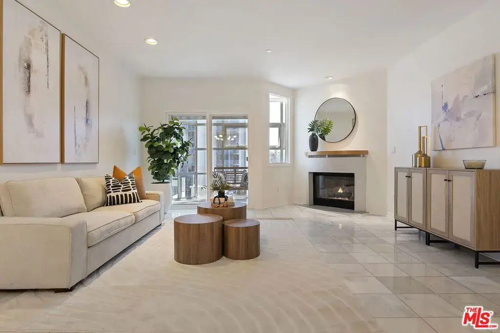 Located in a desirable central Brentwood location, this private and well appointed 2-bedroom, 3-bath townhouse style condo offers a spacious, comfortable layout spanning 1,576 square feet. The upper level features an open-concept design with a modern kitchen equipped with stainless steel appliances, a dedicated dining area, and a generous living room with marble floors, city and mountain views, a gas fireplace, and a large guest powder room. A sun-drenched glass-enclosed bonus space makes the perfect office or reading nook. Downstairs, both bedrooms offer privacy and comfort. The expansive primary suite includes a sitting area, two closets (including a walk-in), and en-suite bath with a soaking tub and separate shower. The second bedroom also enjoys its own full bath. This level also includes a side-by-side laundry area, extra storage, and direct access to a private outdoor patio. Additional amenities include Nest thermostats on each level, side-by-side parking spaces, ample guest parking, and a dedicated storage cage. There are dual entrances, one on each level, providing added flexibility and convenience for daily living, guests, or a work-from-home setup. The secure building offers resort-style living with a pool, spa, sauna, and gym. Ideally located near UCLA, the 405, top-rated schools, and Brentwood’s premier shops and dining.