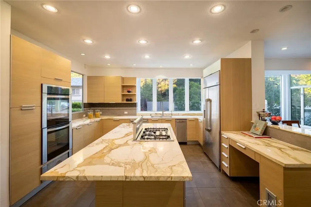 The gorgeous kitchen features quartzite countertops, sleek European cabinetry and pro-style appliances. The kitchen leads out to the wrap-around stone patio, complete with an outdoor kitchen, a fireplace, a pergola and plenty of space to dine & entertain.