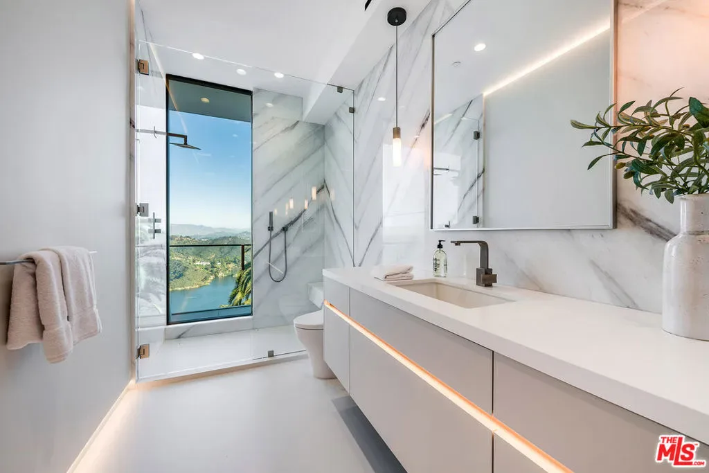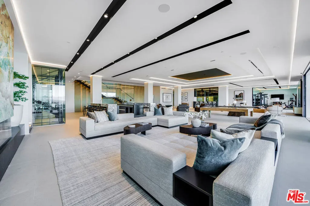VANTAGE rises above Bel Air as a cinematic architectural estate defined by sculptural design, luminous presence, and sweeping panoramic water, canyon, and city views with a seamless connection to its natural surroundings. Approached through a dramatic double gated entry and expansive motor court, the residence reveals custom architectural illumination, tranquil reflecting water features, mature olive trees, and striking backlit onyx columns that create a powerful sense of arrival.Designed to maximize light, views, and flow between living and lounge spaces, the main living pavilion unfolds as a glass wrapped volume suspended above the landscape. Full height automated glass doors with integrated curtain systems dissolve the boundary between interior and exterior, while private balconies extend from every room to create a continuous indoor outdoor living experience. Refined stone surfaces, warm wood tones, and curated materials balance modern precision with organic warmth. A floating green onyx staircase acts as a sculptural spine connecting all levels, enhanced by 28 foot operable skylights that flood the home with natural light and fresh air.The residence features three kitchens, each designed for professional grade performance and seamless service. The main level kitchen showcases dual oversized fully adjustable islands, Gaggenau appliances, European cabinetry, and a walk-in industrial stainless steel refrigeration room. A separate chef’s kitchen with Miele appliances supports large scale preparation, complemented by a discreet service kitchen and outdoor culinary area with pizza oven for catered entertaining.A designated Entertainment Level offers a private two lane bowling alley with its own full bar, cinema grade theater, sophisticated lounge areas, additional bar spaces, temperature controlled wine cellar, and a dedicated Glamour Room designed for private preparation. Throughout the residence, 28 flat screen televisions are professionally installed in nearly every space.A full wellness retreat includes a Turkish hammam with dry sauna and steam room, cold plunge, hot tub, massage area, juice bar, and a glass enclosed fitness studio oriented toward panoramic views.The upper level hosts the primary suite as a private sky level retreat with dual walk-in closets and dual marble and onyx bathrooms appointed with TOTO smart systems. Three additional ensuite bedrooms feature floor to ceiling glass, custom closets, and serene natural finishes.Outdoor living is equally cinematic with an infinity edge pool blending into the horizon, expansive stone terraces, fire features, softly illuminated landscaping, multiple outdoor bars for resort style entertaining, and a private hillside vineyard with approximately 600 trees.Additional features include elevator access to all levels, full smart home and AV integration, thoughtfully designed service circulation, and a high powered 48 kilowatt backup generator.