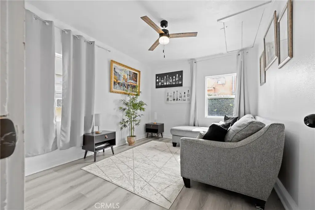 The property consists of two separate buildings. The front structure is a detached 2-bedroom, 1-bath single-family residence featuring a bonus room – ideal for a home office, playroom, or potential conversion to a third bedroom. The home has been updated with vinyl flooring, smooth ceilings, recessed lighting, and a fenced front yard, offering a private, residential feel.