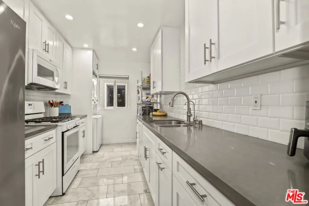Perched on the top floor in one of West LA’s most desirable locations, this beautifully remodeled 3-bedroom, 2-bath residence offers the perfect blend of comfort, style, and convenience within the highly sought-after Westwood Charter School District. Filled with natural light, the expansive open-concept living space creates an inviting atmosphere for both everyday living and entertaining. The spacious living room is anchored by a cozy gas fireplace and opens to a private balcony perfect for enjoying morning coffee or relaxing in the evening. Elegant laminate wood flooring flows throughout the main living areas and into a dedicated dining space, enhancing the home’s warm and airy feel. The thoughtfully designed kitchen features sleek quartz countertops, classic white shaker cabinetry, a refrigerator with water and ice dispenser, and abundant counter space for cooking and gathering. A generous walk-in pantry in the hallway provides exceptional storage and functionality. All three bedrooms are generously sized, with two offering spacious walk-in closets, including the tranquil primary suite. The primary bedroom serves as a peaceful retreat with its own en-suite bathroom featuring dual vanities with quartz countertops and a beautifully designed walk-in shower. Two of the bedrooms also share access to a large private balcony, creating an additional outdoor space to relax and enjoy the fresh air. Additional highlights include an in-unit washer and dryer, a modern ductless heating and cooling system for year-round comfort, side-by-side parking, and a private storage unit located in the garage. Ideally located just moments from UCLA, this exceptional home places you close to Westwood’s vibrant dining, Sawtelle restaurants, shopping, and entertainment while offering the privacy and comfort of a top-floor residence with easy nearby public transportation to get you whenever you need to go quickly!