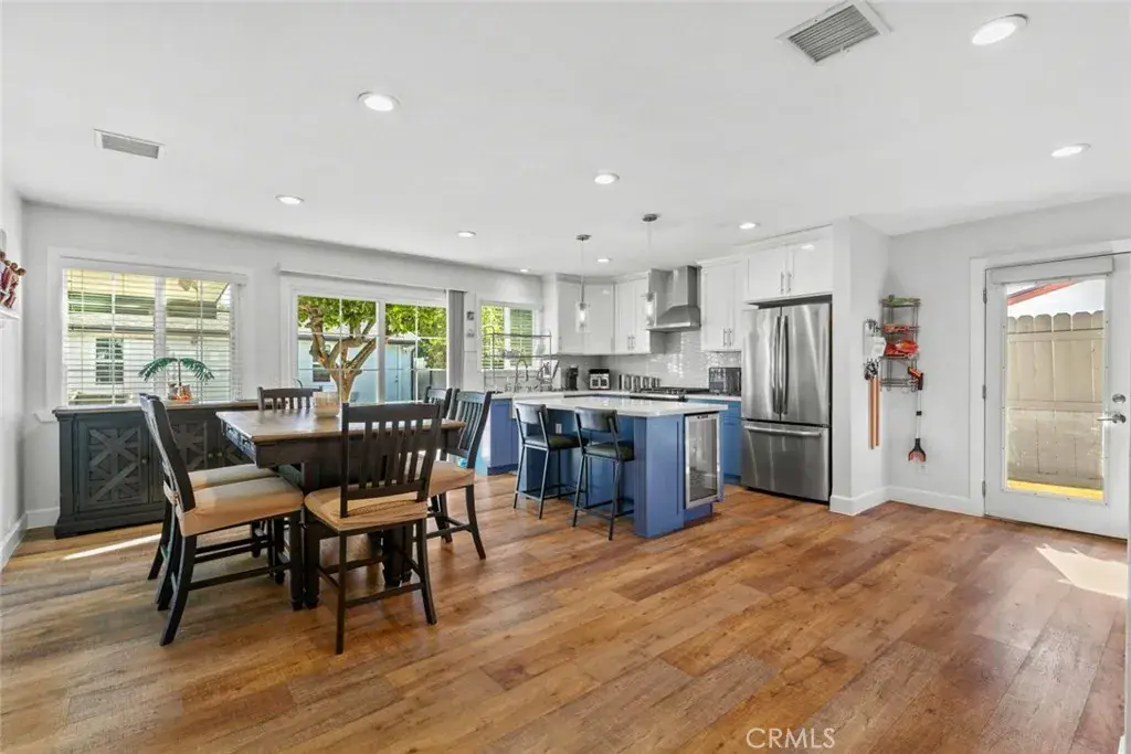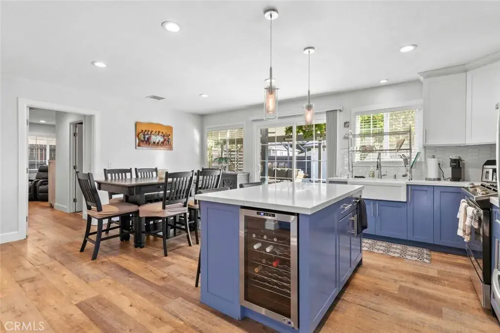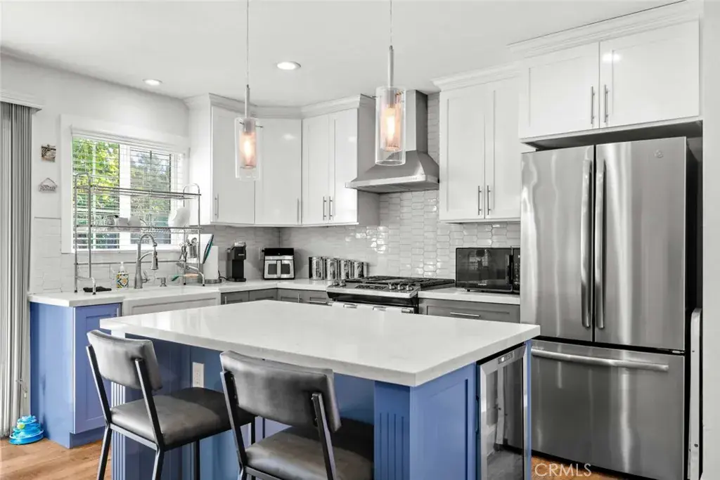 The interior offers an open layout with natural light, wood tone flooring, recessed lighting, and a comfortable flow ideal for everyday living and entertaining. The updated kitchen serves as a true centerpiece and includes stainless steel appliances, a farmhouse sink, white countertops, and a spacious island with a built in wine cooler, creating an inviting setting for cooking and gathering. Both bathrooms have been tastefully remodeled, and the home includes a convenient interior laundry area.