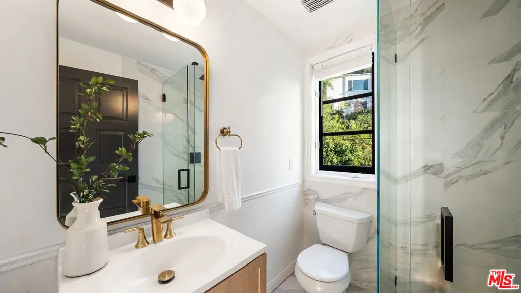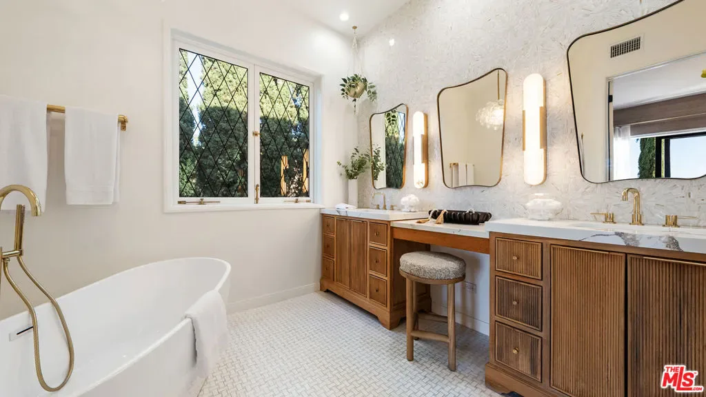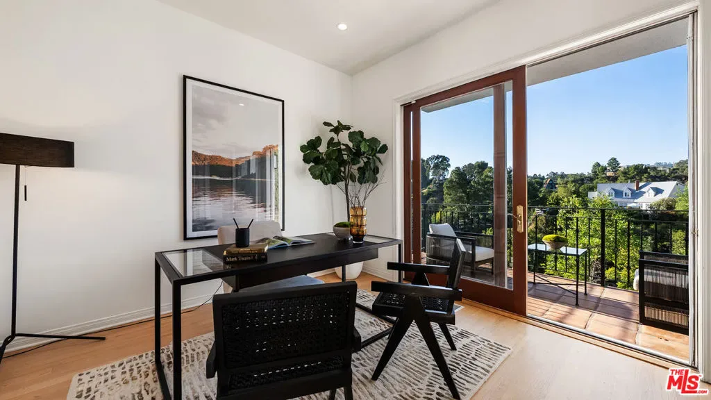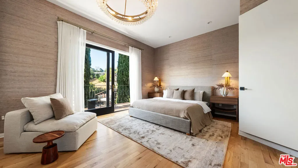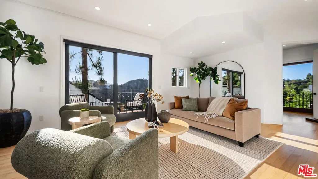 Tucked away in the privacy of Laurel Canyon, this thoughtfully updated contemporary art-deco retreat offers sweeping views of rolling hills and a true sense of calm, all while remaining just minutes from the heart of Los Angeles. Framed by mature cypress trees and filled with natural light, the home feels like a private escape with a strong connection to its canyon setting. The main residence features four bedrooms and four bathrooms with refined finishes and a highly functional layout ideal for both everyday living and entertaining. Two distinct living areas flow seamlessly into a gourmet kitchen, while multiple balconies invite indoor outdoor living and showcase serene canyon views from nearly every angle. The primary suite serves as a private sanctuary with expansive views, custom closets, and a spa inspired bathroom featuring marble finishes, a soaking tub, heated floors, and a glass enclosed shower. Below the main home, a separate one bedroom guest residence offers its own private entrance, full kitchen, in unit laundry, sunroom, and wrap around deck, making it ideal for guests, extended family, or a home office. Outdoor living is exceptional with multiple tiered decks designed for lounging, dining, and entertaining, along with a spa perfect for relaxing day or night. Additional amenities include a two car garage, private carport, ample parking, and a quiet cul de sac location, delivering a rare blend of privacy, comfort, and refined canyon living in one of the most sought after enclaves of the Hollywood Hills.