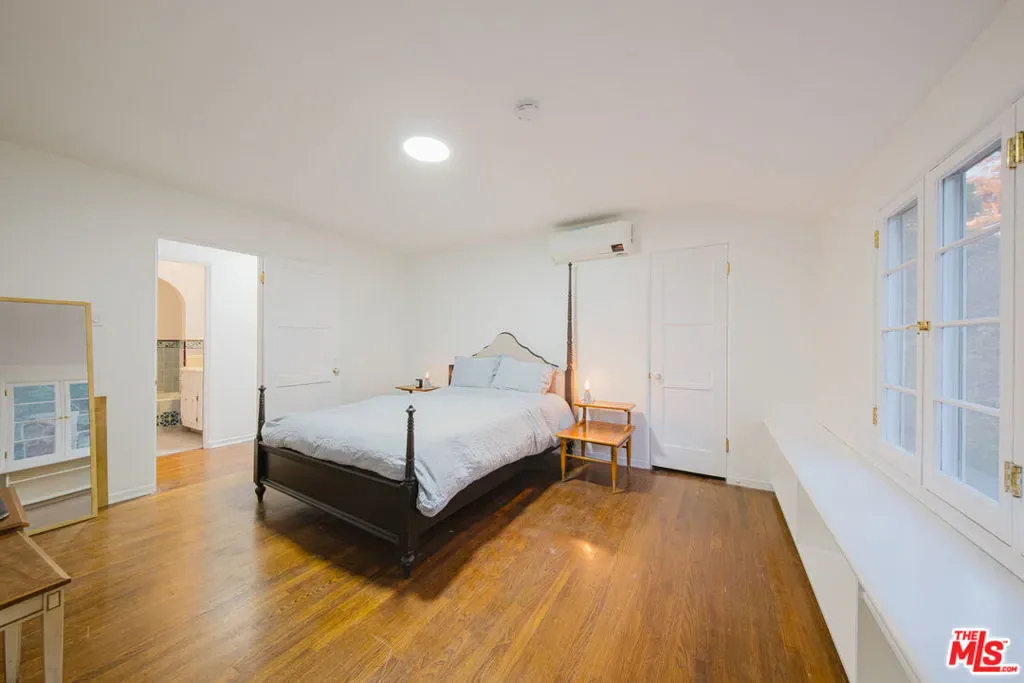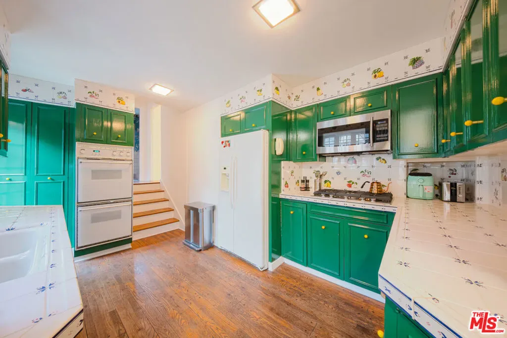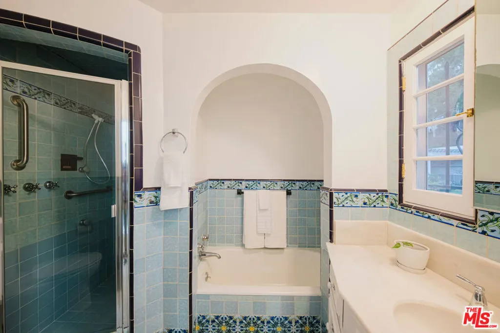 Nestled in the historic Hollywood Hills, this enchanting Spanish-style villa offers a cinematic backdrop for easy living. Built with architectural character and a timeless aesthetic, the home boasts a tiled roof, wrought iron details, and a grand entryway framed by lush greenery. Inside, vaulted ceilings, arched windows, and an abundance of natural light create a serene and versatile environment. The kitchen features bold green cabinetry with vintage tile detailing, bringing a playful, whimsical touch to the space. The dining room exudes charm with rustic wood furnishings and a chandelier that complements its classic, minimalistic style. The living room centers around a stunning fireplace adorned with hand-painted tiles, offering an ideal setting for intimate gatherings. The outdoors are equally captivating with a sprawling private pristine pool area surrounded by terracotta tiles and lush landscaping. A pergola and lounge area make this backyard perfect for entertaining, photo shoots, or poolside productions at golden hour. For an added touch of character, the lower level includes a cozy media room with exposed beams, navy walls, and eclectic furnishings. This media room was built by a sound designer and it’s a professional-quality screening room. This location’s thoughtful blend of historic details and modern updates makes it a perfect place to call home.
