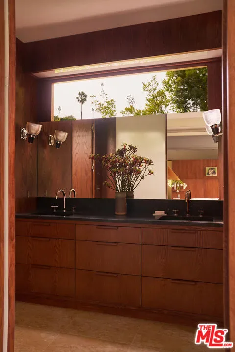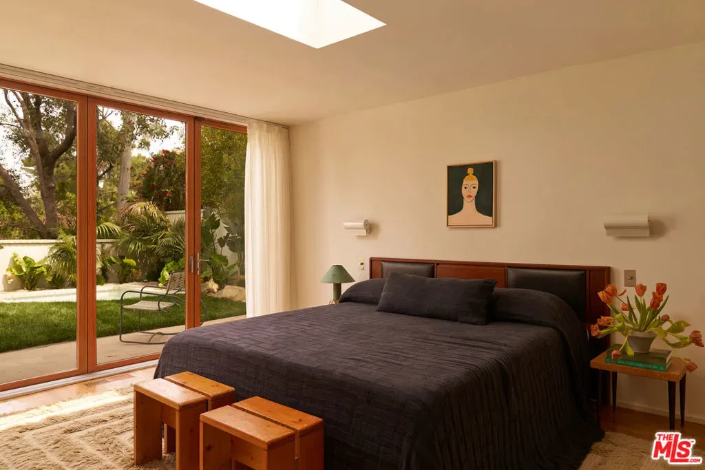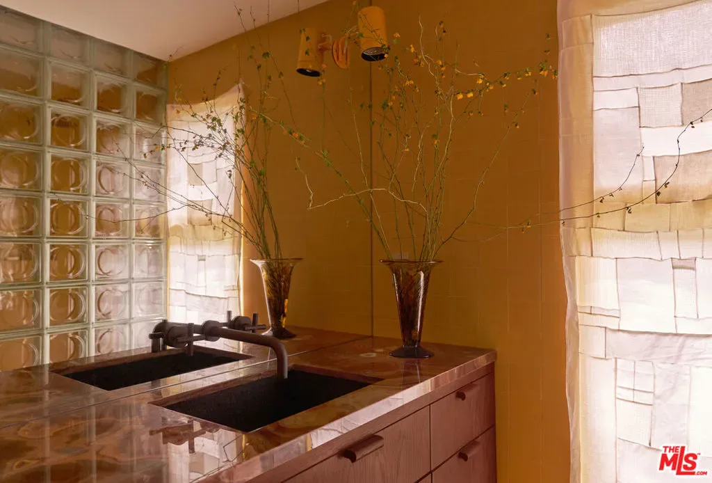 Set in a quiet pocket of the hills within The Colony is a sought-after enclave known for its concentration of beautifully preserved mid-century homes the property captures a rare balance of privacy and connection, evoking a distinct Palm Springs sensibility. Mature trees and lush tropical plantings create a layered, almost cinematic landscape, the setting feels both grounded and quietly removed.Originally built in 1960, the residence stands as a distinctive example of mid-century modern architecture, defined by its sculptural rooflines, angular geometry, and rhythmic architectural elements that shape both light and volume. Designed by Whitney R. Smith of the firm Smith & Williams, the home reflects a thoughtful dialogue between structure and environment. Set on an 8,802 sq ft lot, this 4 bedroom/3.5 bathroom property has been carefully reimagined by interior design studio Ome Dezin, preserving its architectural integrity while introducing a refined contemporary sensibility. A newly crafted oversized pivot door opens to a striking double-height foyer, where gallery-like proportions and a sawtooth ceiling allow natural light to pour in, immediately setting the tone. The flow unfolds organically across two levels, guided by a newly designed sculptural spiral staircase its bold red underside becoming both a visual anchor and a quiet statement piece. The main living spaces are defined by clarity and openness: a generous living room with a mid-century fireplace connects seamlessly to a dining area and a large open custom kitchen, centered around an expansive marble island. Materials are deliberate and tactile, with a focus on quality, proportion, and calm continuity throughout. The first level includes a lounge open to the foyer, a private bedroom suite with direct access to the garden and jacuzzi area, and a spacious bathroom that showcases refined materials. This thoughtfully designed space features a detailed layout, complete with an open shower that transitions through double glass doors to the outdoors. Dual built-out closets add to the convenience.A second wing features two additional bedrooms with integrated storage, connected to a vibrant, light-filled shared bathroom that boasts a sunny yellow, lemony color palette, complemented by copper accents and glass bricks, all quintessentially mid-century. A dedicated laundry room is conveniently located on this level. Ascending the staircase, a skylit landing opens into a library and reading space with built-in vintage speakers. The primary bedroom suite is expansive, with original high ceilings giving a loft-like vibe, plus a large custom-designed dressing room offering generous storage, alongside a grand, refined, and minimalist bathroom that features a striking view of the hills above the double vanity sink. The luxurious open shower, flanked by marble finishes, creates a serene retreat. A full-length balcony extends from the suite, overlooking the garden, pool, and surrounding greenery, with distant mountain views completing the composition.Outdoors, the grounds are arranged across two levels. The first features a fully re-plastered pool, lounge area, in-ground spa, and outdoor dining space, where the home’s architectural lines can be appreciated in full.A second, more secluded tier offers a shaded terrace, a Zen garden, and a sauna creating a series of intimate environments within the landscape. Additional features include a large double garage with built-in storage, controlled access from both sides of the property, and a consistent emphasis on privacy, light, and spatial harmony throughout. “The Colony” is located in Upper Nichols Canyon, only minutes from the most iconic spots Hollywood has to offer. This is a rare opportunity to acquire a thoughtfully restored mid-century residence, one that remains true to its origins while benefiting from the careful vision of its most recent design intervention. Welcome home!
