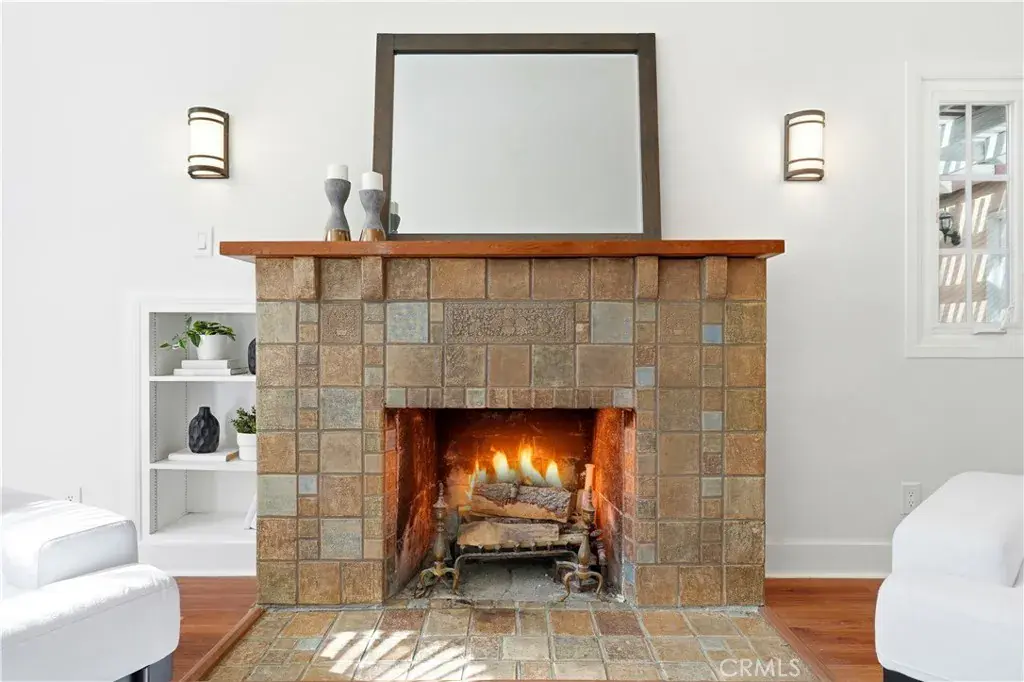 Inside, original charm meets warm sophistication. The home is anchored by a stunning Batchelder fireplace — a true architectural centerpiece and a nod to the craftsmanship of Hollywood’s golden era. Natural light pours into the living spaces, creating an inviting yet refined atmosphere ideal for both quiet evenings and elevated entertaining.
