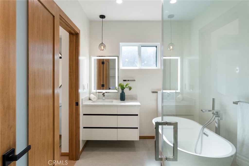 The primary suite is a peaceful retreat, complete with a large walk-in closet, a built-in closet & make-up area. A spa-inspired bathroom with a walking shower & a soaking tub. All bedrooms are en-suite with generous closet space, built-in sound systems, and motion lighting for modern comfort.