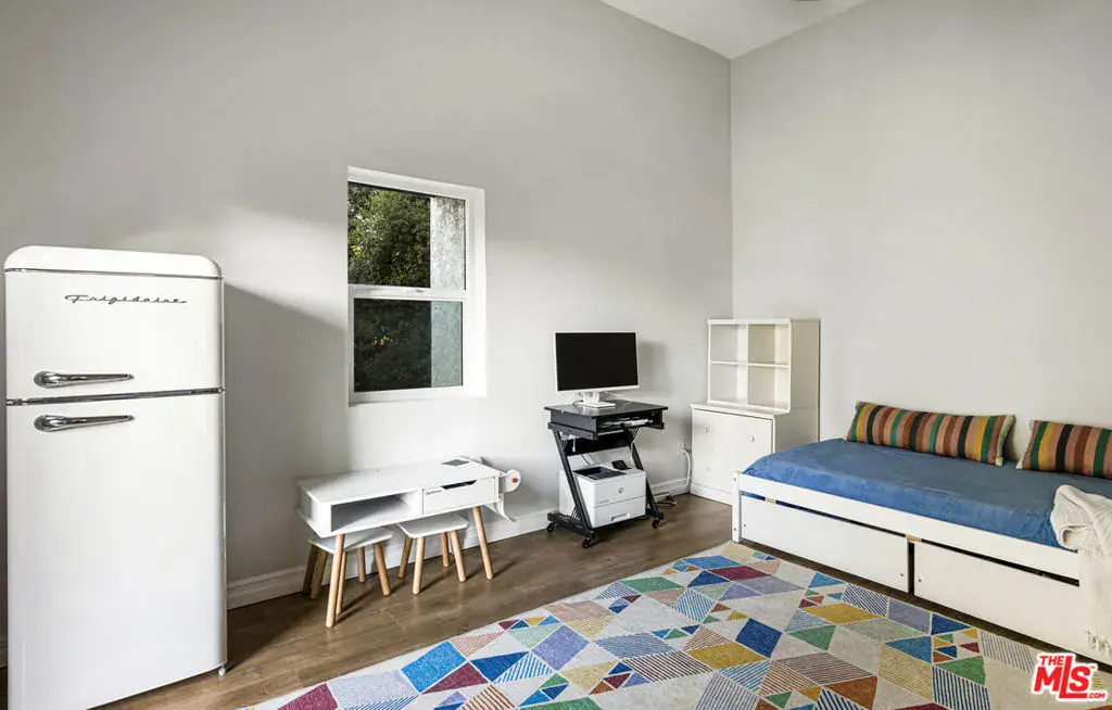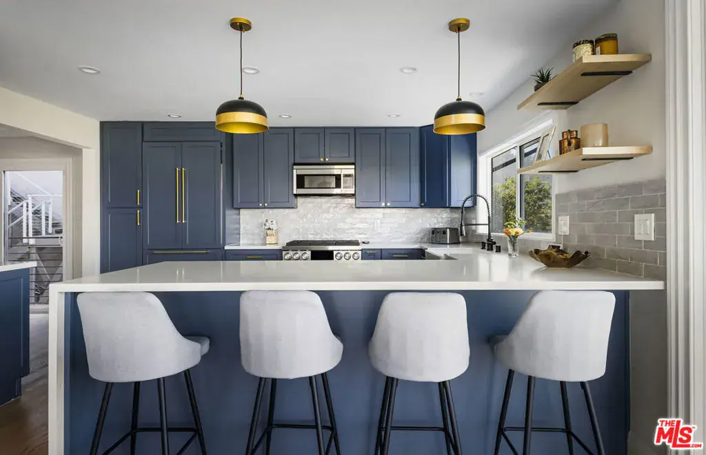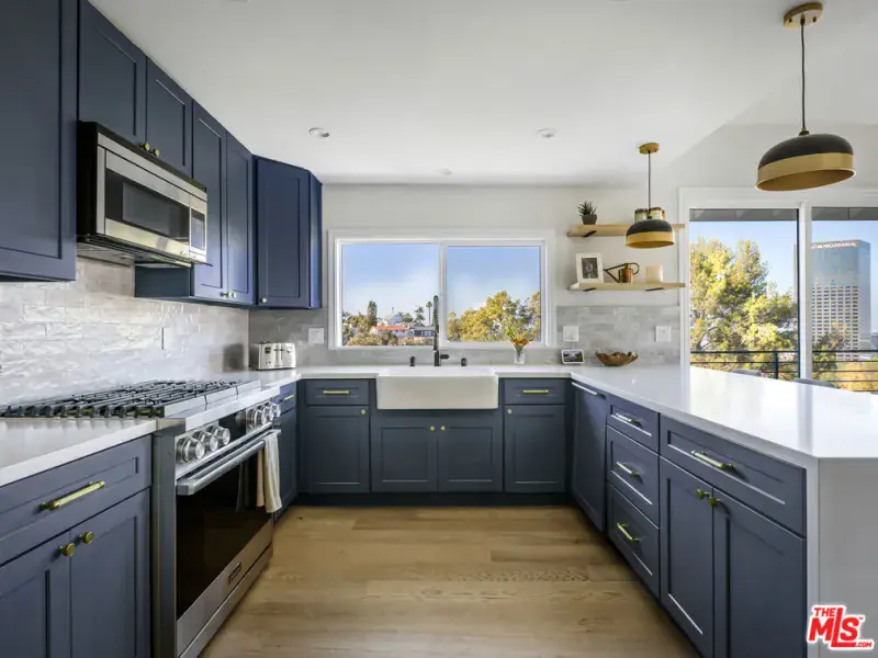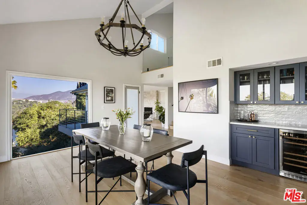 Perched above the trees south of the Boulevard, this newly remodeled Hollywood Hills home embraces light, space, and design with effortless confidence. Walls of glass frame sweeping canyon and city views, drawing the outdoors into daily life. The main level is designed around connection and light. The kitchen acts as the central bridge between the dining and family room, a seamless flow that encourages gathering and conversation. Nearly every room opens to a balcony, blurring boundaries and filling the home with air and light. The primary suite feels calm and elevated, featuring a large double walk-in closet and a spacious, spa-inspired bath with a soaking tub, standing shower, and double vanity. The lower level adds versatility with a private guest quarter that doubles as an office, studio, or gym. Outside, a newly refinished expansive deck is tucked among mature greenery, creating a secluded backdrop for outdoor dining and quiet moments. Modern comforts include a direct-access two-car garage with EV charging and updated systems throughout. Secluded yet connected just minutes from the energy of the Boulevard, yet a world apart. Public record shows 2324 sq ft. Vendor measurements are 2650 sq ft including the guest quarters.