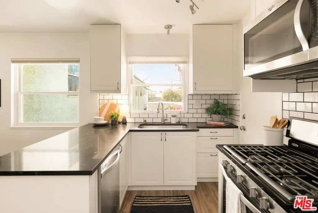 Come see the best value condo in West LA! 3641 Kalsman Dr Unit 4 is a top-floor 2-bedroom, 1.5-bathroom condominium that was lovingly upgraded by an owner who paid attention to the details. Elevated interior features include rigid-core luxury vinyl plank flooring laid over acoustic-insulating cork, double-hung dual-pane windows with custom treatments, and solid wood interior doors, all of which maximize durability and create a quiet, relaxing atmosphere. The kitchen was renovated with chic Caesarstone countertops, a matching subway tile backsplash, soft-close cabinetry, sleek stainless-steel appliances, and water filtration systems for both the kitchen sink and the automated ice machine. Recessed and dimmable lighting throughout further add to the premium feel of the unit. Both bedrooms are spacious, private retreats. Oversized closets with sliding mirror doors and whisper-quiet Casablanca ceiling fans ensure year-round comfort. The in-unit washer and dryer, central heat, and a private one-car garage with built-in storage cabinets provide ultimate convenience. Residents also benefit from an additional parking space in the common area and plenty of on-site parking for guests. The condo sits within Cameo Woods, a 24/7 guard-gated community providing resort-style living. This is one of the best-positioned units in the complex, centrally located away from the noise of any public streets. The top-floor elevation allows in excellent natural lighting. Picturesque views of mature trees and grassy courtyards from every room enhance the sense of peace and tranquility that other units simply do not provide. Life within this community feels like living in a private park, with over 20 acres of landscaped grounds to enjoy. Amenities include a pool, two hot tubs, a tennis court, a dog run, a community garden and a clubhouse. This home offers easy access to Downtown Culver City, West Adams, Downtown LA, LAX, local beaches, the Baldwin Hills Scenic Overlook, Kenneth Hahn Park, and the Expo Line, making it an ideal choice for those seeking a move-in ready home in a vibrant neighborhood.