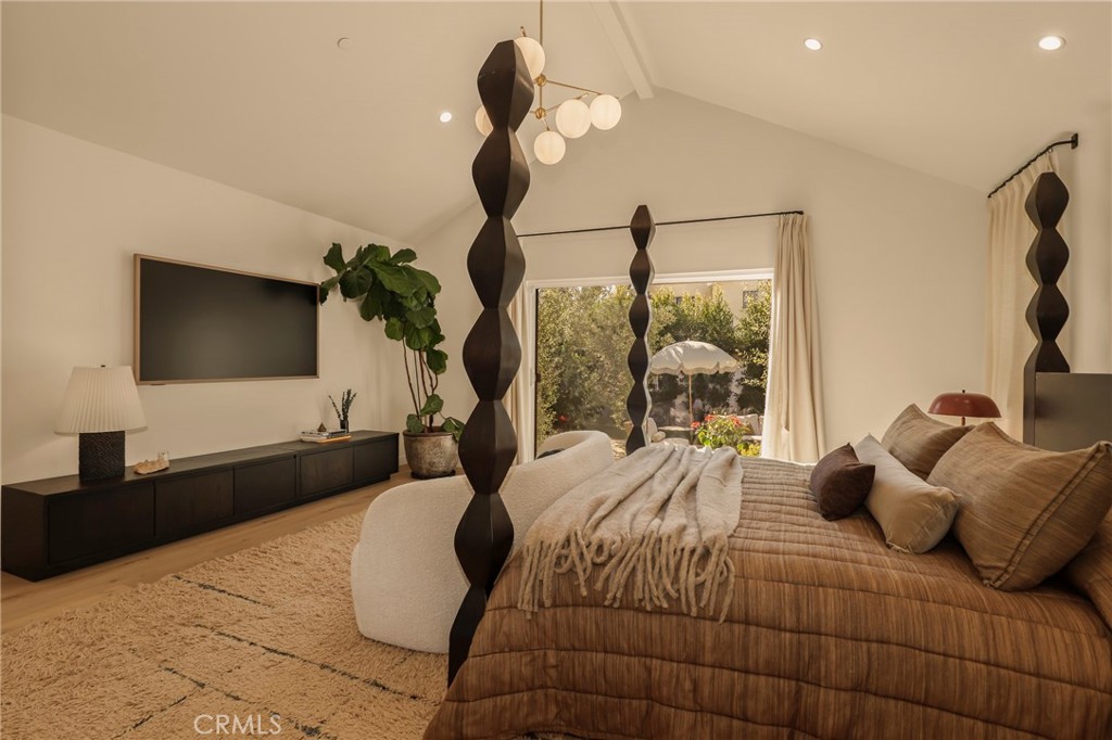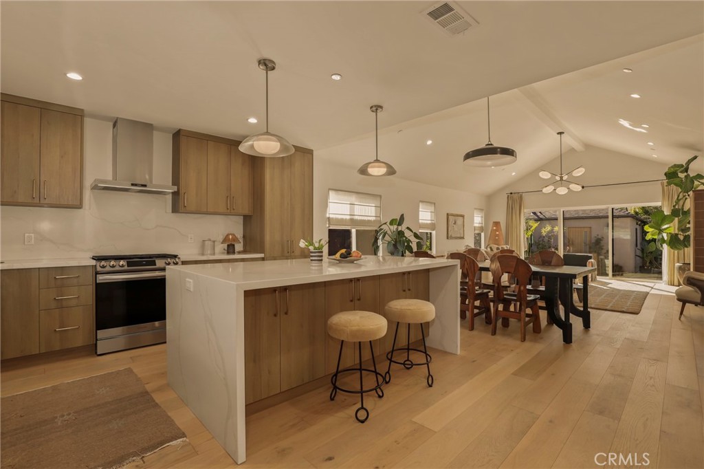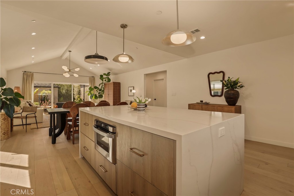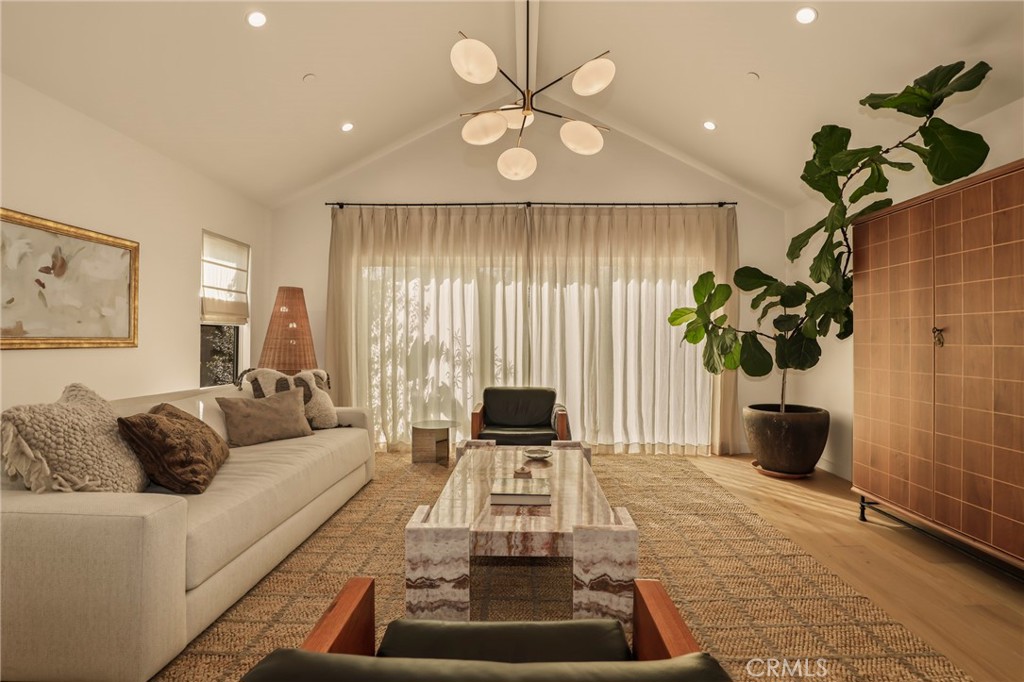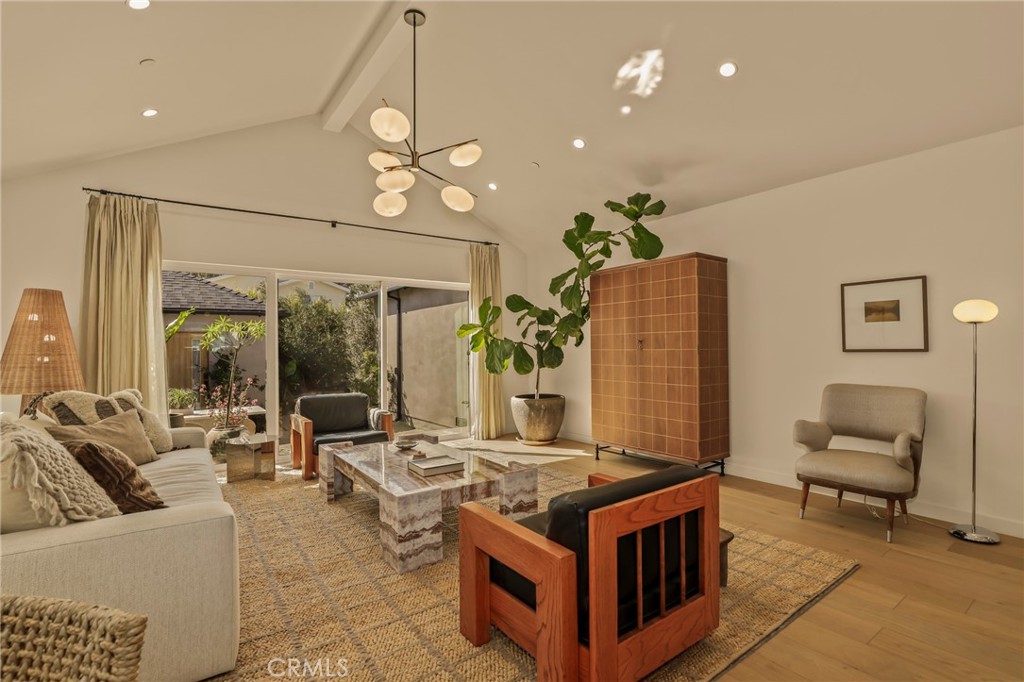 The main residence features an airy open-concept floor plan with vaulted ceilings in the living room and primary bedroom, creating dramatic volume and natural light. The designer chef’s kitchen is the centerpiece of the home, appointed with custom cabinetry, quartz countertops and full-height backsplash, stainless-steel appliances, and a large statement island that flows seamlessly into the expansive living and dining areas—ideal for entertaining and effortless indoor–outdoor living. The serene primary suite serves as a private retreat with a spacious walk-in closet and a spa-inspired bathroom with curated finishes.