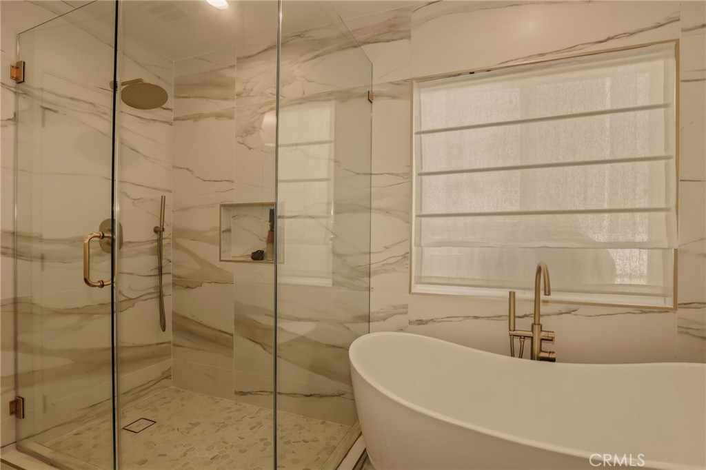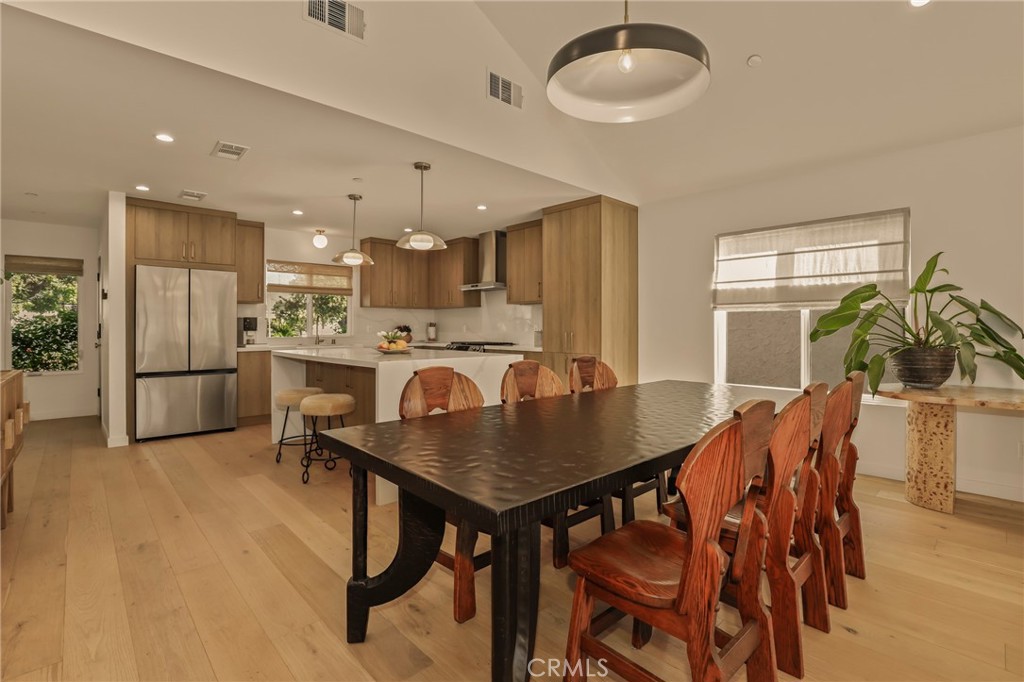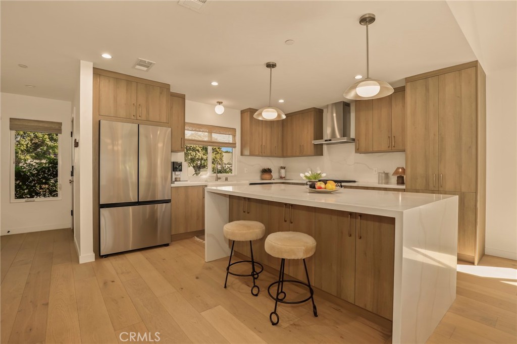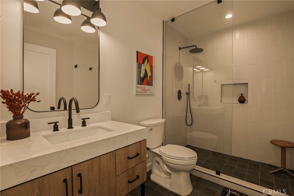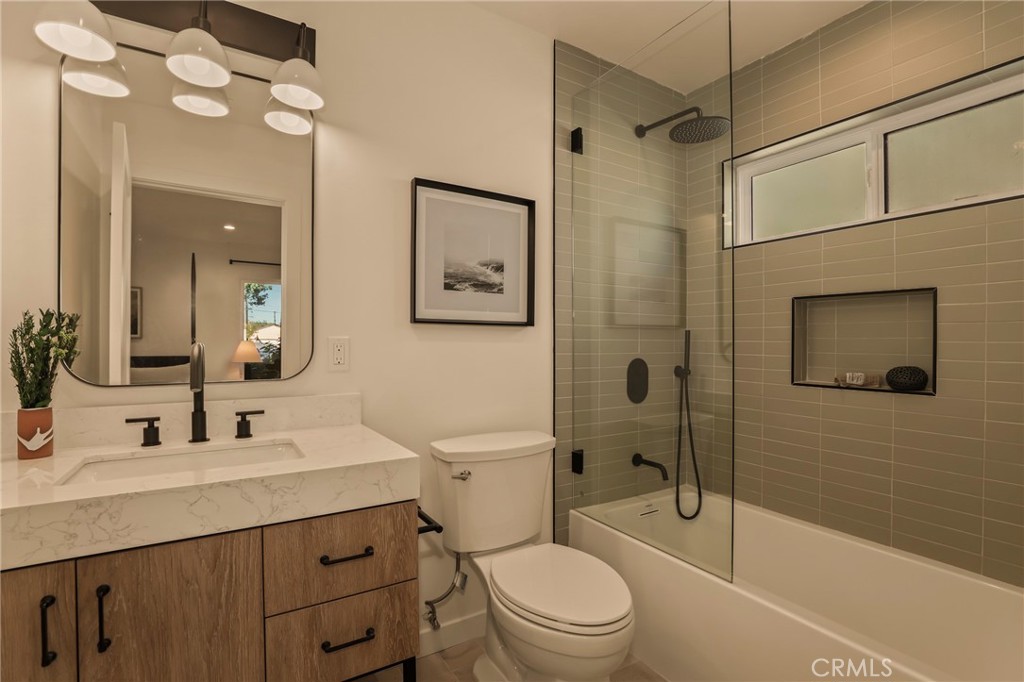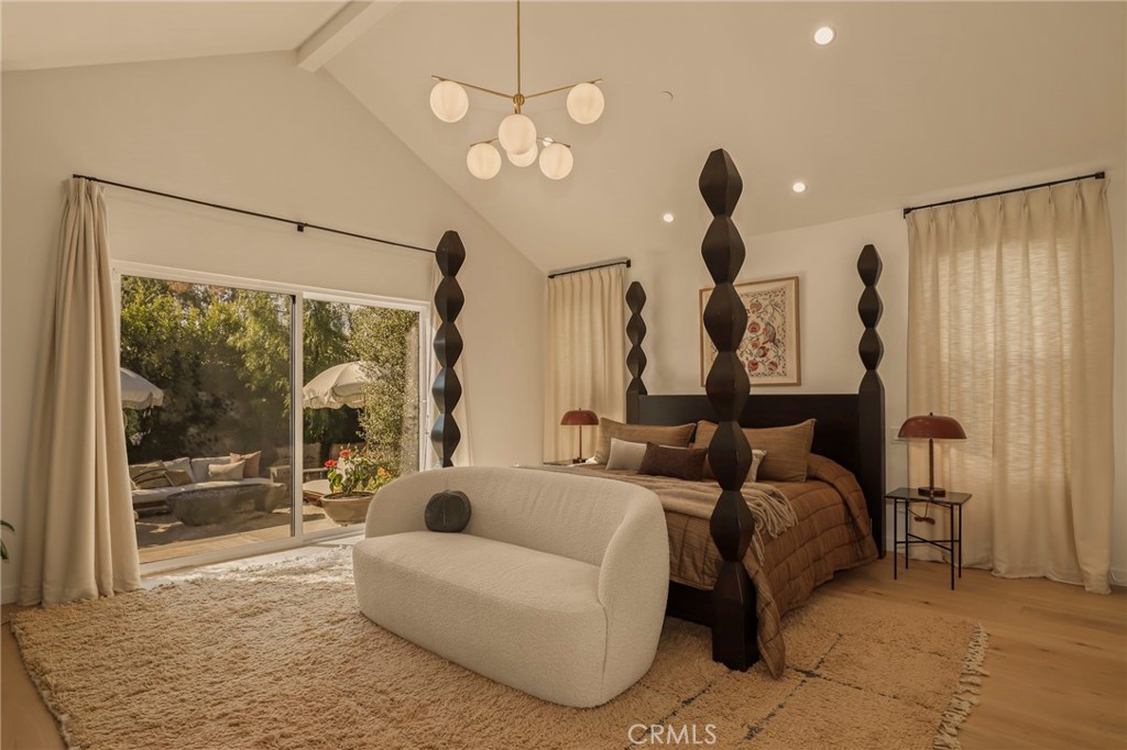 The main residence features an airy open-concept floor plan with vaulted ceilings in the living room and primary bedroom, creating dramatic volume and natural light. The designer chef’s kitchen is the centerpiece of the home, appointed with custom cabinetry, quartz countertops and full-height backsplash, stainless-steel appliances, and a large statement island that flows seamlessly into the expansive living and dining areas—ideal for entertaining and effortless indoor–outdoor living. The serene primary suite serves as a private retreat with a spacious walk-in closet and a spa-inspired bathroom with curated finishes.