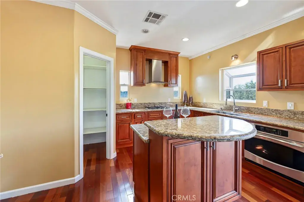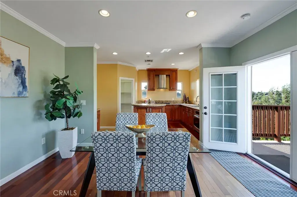 • Chef-inspired kitchen with high ceilings, custom cabinetry, pantry, island seating, and double glass doors opening to a spacious balcony overlooking mature trees and twinkling city lights