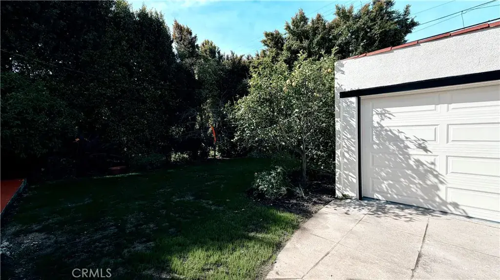 The private backyard includes a grassy area and patio space ideal for outdoor dining and entertaining. A detached garage and long driveway provide ample parking.