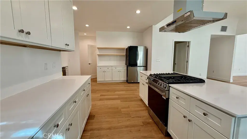 The expansive living room with a sleek contemporary fireplace flows seamlessly into a designer kitchen with custom cabinetry, a center island, and ample storage. All appliances are brand new and have never been used, including the refrigerator, washer, and dryer. The home has not been occupied since completion of the renovation, offering a true “new home” feel.